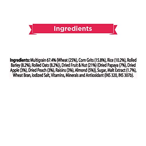 Five nutritious grains (Wheat Oats Rice Corn and Barley ) and five delicious inclusions (papaya apple peach raisins & nut) come together to make ready-to-eat delicious breakfast cereal.