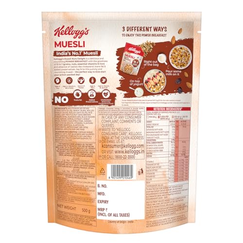 Nourishing & Tasty Breakfast Cereal â Say Hi to a delightful POWER BREAKFAST filled with goodness of 12 in 1 bowl. It is infused with the goodness of multigrain almonds and raisins. This Muesli breakfast will help you kick-start your mornings. It is a nourishing and tasty meal that will get you ready to seize your action-packed day. IndiaNo.1* Muesli: KelloggMuesli is IndiaNo. 1 Muesli brand (*refer pack/website for details). Power Breakfast for a Healthy Start: Made with nutritious grains & delicious inclusions â the âNew KelloggMuesli Nuts Delight 12-in-1 Power Breakfast comes with the goodness of 5 baked grains (Oats Wheat Barley Corn & Rice) an abundance Almonds & Raisins along with essential vitamins & iron - giving this Muesli a yummy blend of flavour and crunchy texture in your breakfast bowl. Powerhouse of nutrients: This power-packed breakfast is high in Iron Vitamin C B6 & Folate. It is high in fibre Vitamins B1 B2 & B3 and is also a source of protein. No Nasties: KelloggMuesli has no trans-fat and no added preservatives. It is also naturally cholesterol-free. 3 ways to enjoy this Power Breakfast â Have it right out of the bag or have it in a bowl and pour some milk on it or couple it with yogurt. Just take a handful of KelloggMuesli and feel naturebounty in its grainy nutty goodness! Your Go-To Breakfast â KelloggMuesli gives you a perfect start with multigrain energy for busy mornings. You can count on Kelloggfor a great-tasting convenient and a nourishing breakfast that fuels your hunger to achieve.