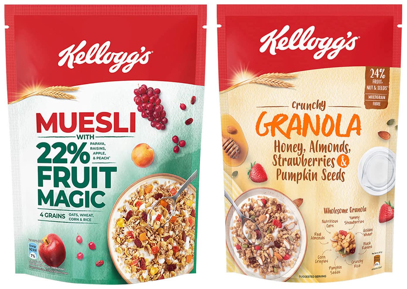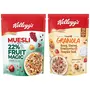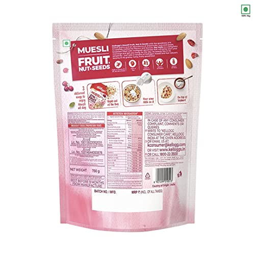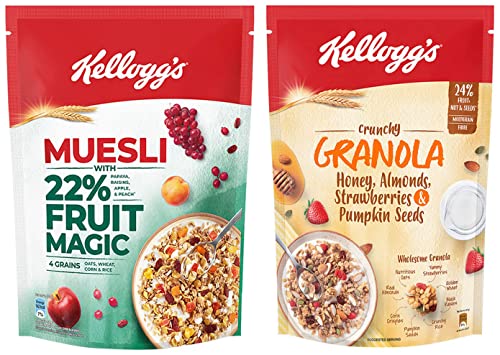 Kellogg's Muesli with 21% Fruit Nut & Seeds |Tastier now with Cranberries and Pumpkin Seeds |Breakfast Cereal | High in Iron| Source of Fibre | Naturally Cholesterol Free | 750g PackKellogg's muesli fruit & nut with the goodness of 5 baked grains and an abundance of dried fruits and nuts is carefully crafted for flavour and texture. Say hello to a delightful breakfast filled with multigrain goodness that will jump-start your mornings and get you ready for the day. Its beauty lies in its simplicity - just take a handful of Kellogg's muesli and feel nature's bounty in its grainy nutty fruity goodness!.Kellogg's Crunchy Granola Honey Almonds Strawberries & Pumpkin Seeds Breakfast Cereals Multigrain Flakes 450gKellogg's Crunchy Granola is a toasty oven-baked creation carefully crafted for flavour and texture. Say hello to a delightful breakfast filled with multigrain goodness that your taste-buds and body will love! Your taste-buds will love our perfectly baked multigrain clusters that are generously loaded with crunchy almonds rich honey yummy strawberries and super-food pumpkin seeds. Your body will love the goodness of multigrain and fibre!