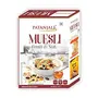 Patanjali muesli is a delicious breakfast and brunch dish based on raw oats and other ingredients like grain, fresh or dried fruits, seeds and nuts. Muesli can be served & mixed with cow's milk, almonds milk, soy milk, yogurt or fruit juice. Its is a rich source of vitamins, mineral, fruit extract and antioxidant-rich honey.1.Patanjali Muesli Fruit and Nut is a protein-rich breakfast and brunch option made with tasted whole rice and oats, dried nuts, succulent sun-dried fruits and wheat flakes, Muesli is healthier than any cereal.2. It rich source of nutrients like fiber, vitamins minerals and antioxidants to provides the perfect breakfast to jump-start your day.3. It typically has less sugar and calories than most breakfast cereals4.It contains high in fiber and whole grains, which regulate the digestive system.5. It aids in weight control. The addition of nuts provides a great source of protein and Omega -3 fatty acids.Muesli is a potent source of antioxidants.Corn flakesWheat flakesRice flakesblack raisinsAlmondsDried pineappleDried papayaDried appleliquid glucoseHoneyBHA