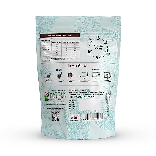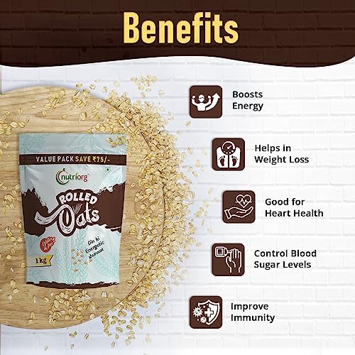 Nutriorg Rolled Oats 1kg |Premium Golden Rolled Oats Gluten Free Oats with High Fibre 100% Whole Grain Non GMO | Healthy Food with No Added Sugar | Diet Food for Weight Loss - 1kg
