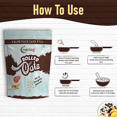 Nutriorg Rolled Oats 1Kg | Gluten Free Oats | Wholegrain Oats | High Fiber & Protein-Rich Oats | Ideal for Weight Loss & Breakfast | 100% Natural Oats