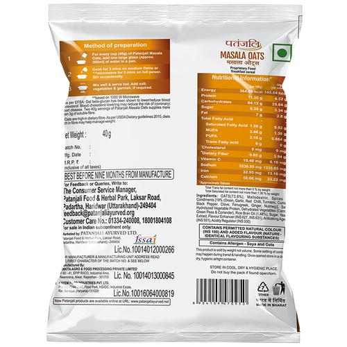 Patanjalis Masala Oats are a lip-smacking blend of traditional masale (spices) combined with one of the healthiest grainsoats. The perfect way to start the Indian day, Masala Oats is a healthy option to replace fried and heavy foods early in the day. Loaded with delicious vegetables and spices, the quick-cooking porridge gets ready in 3 minutes. Rich in fibre, iron, protein and carbohydrates, oats are valued for their ability to control cholesterol and maintain weight. The rich aroma of Patanjali Masala Oats makes this a healthy breakfast option for Indian homes that love to start their day with a bite of tradition. Have as it is, or serve hot with curd.* Fast cooking* Helps control cholesterol* Helps manage weight* Spicy taste* Oats (75%)* Maltodextrin* Spices & condiments (onion, garlic, red chillies, turmeric cumin, black pepper, clove, fenugreek, ginger, nutmeg)* Salt* Hydrolyzed vegetable protein* Dehydrated vegetables (carrot, green, peas & coriander)* Sugar* Yeast extract* Flavour enhancer (INS 627 INS 631)* Anticaking agent (INS 551)* Acidity regulator (INS 330)