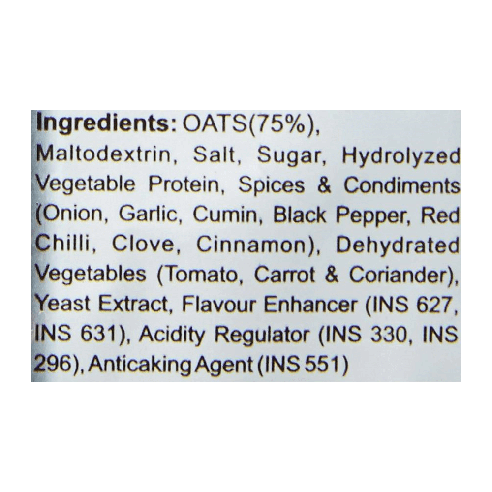 Patanjali Tomato Oats 200Gm, 400Gm Patanjali Tomato Oats is an alternative for your healthy breakfast. These packets are made from premium quality ingredients.Ingredients :Made from rich collection of natural and herbal ingredient, this package is made from:Oats (75%) Maltodextrin Salt Spices and condiments (onion, garlic, red chillies, turmeric, cumin, black pepper, clove, fenugreek, ginger, nutmeg)Salt Hydrolyzed vegetable protein Dehydrated vegetables (carrots, green peas and coriander) Sugar Yeast extract Flavour enhancer (ins 627ins 631) Anti-caking agent (ins551) Acidity regulator (ins 330) Health Benefits :Patanjali Tomato Oats has several health benefits. Provides youNutritious and flavourfulFast cookingHelps manage fatHelps manage weightHow to Use :For every cup of Patanjali Tomato oats add one large glass of water in a pan. Cook for 3 mins on medium flame adds salt vegetables. Mix well and serve hot. Disclaimer: The product is guaranteed to be 100% genuine. Product images are for illustrative purposes only. Images/packaging/ labels may vary from time t