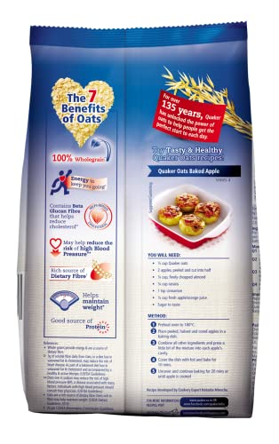 Quaker Oats 600 g | Rolled Oats | 100% Natural Wholegrain | Nutritious Breakfast Cereals | Porridge | Easy to CookWith the goodness of 4 different grains - oats wheat ragi and barley in one pack Quaker Oats give you the energy to do more of what you love!! The multigrain advantage - oats are good for your heart + wheat is a source of energy + barley is rich in fibre + ragi is a source of calcium. One serve of Quaker Oats (45g of dry product) will give you energy equal to 2 phulkas(rotis) fibre equal to 1¼ apples and protein quantity equal to ½ a cup cooked chana dal. Quaker Oats is 92% fat-free which may help reduce risk of heart diseases. Get your healthy breakfast every day with the benefits of multigrain in a wholesome bowl of Quaker in just 3 minutes. Try it with delicious toppings of fresh or dried fruits nuts or cinnamon.Quaker Oats 1.5kg Rolled Oats Natural Wholegrain Nutritious Breakfast Cereals Dalia Porridge Easy to Cook" Make your mornings nutritious and tasty with Quaker natural whole grain oats! Start the day right with a bowl of nutritious Quaker Oats! These 100% Natural Wholegrain Oats have complex carbohydrates that break down slowly providing lasting energy. Along with an active lifestyle consuming 2 bowls of oats per day provides 3g of soluble fiber and Beta-glucan; this helps reduce cholesterol as part of a diet low in saturated fat and sodium. They are also a rich source of fiber and protein. Quaker Oats can either be eaten sweet or savory. Enjoy the wholesome benefits of this whole grain in various meals or snacks at any time of the day. For a hearty breakfast meal add milk topped with fruits and nuts; for a warming sweet flavor add honey cinnamon or brown sugar. You can also add them as a wholesome ingredient in your favorite dishes such as Idli Poha Masala Oats or Classic Oatmeal cookies. Key benefits: 100% Natural Wholegrain Helps Reduce Cholesterol 2X Protein & Fibre Lasting Energy Helps Maintain Weight *Whole grain council. **Oats contain fiber & slowly absorbed carbohydrates that can increase satiety (providing lasting energy). ***3g or more per day of soluble fiber from oats helps reduce blood total- and LDL- cholesterol levels **** Comparison with similar food: ‘Breakfast cereal (cornflakes)’. Atlas of Indian Food 2015 "