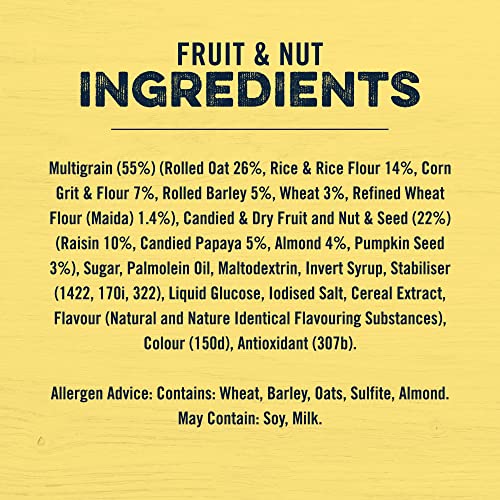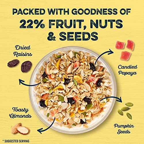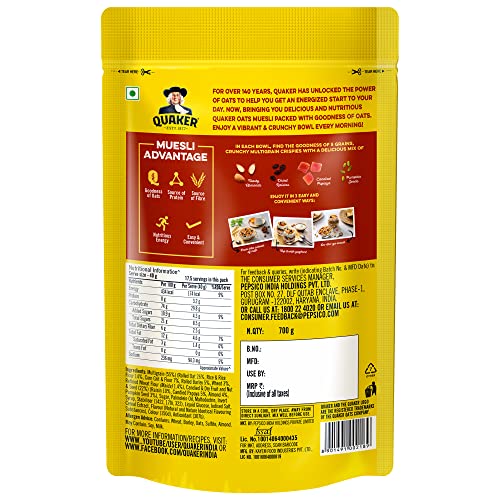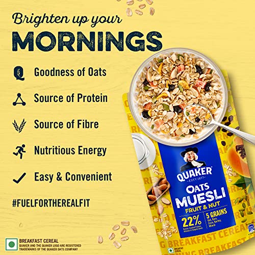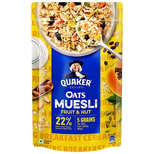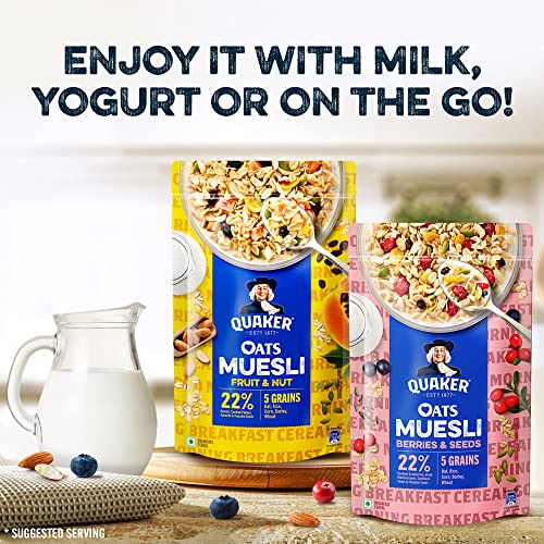 Brighten Up your Mornings with a Nutritious & Delicious Breakfast Cereal!Drop your worries on preparation time aside this multigrain goodness is easy & convenient and requires no cooking. Packed with a delicious mix of fruits and nuts you'll always be prepared to take on the day with nutritious breakfast oatmeal.Quaker Oats Muesli Berries & Seeds is packed with 22% of Berries Fruit & Seeds: delicious mix of raisins candied papaya almonds and pumpkin seeds. You can easily enjoy this multigrain delight as a breakfast cereal by pouring into a bowl of milk; topping it with your favorite yogurt; or simply consuming it as it is for your on-the-go snack! This is your fuel for the real fit at any time of the day!Key Benefits: Goodness of OatsSource of ProteinSource of FiberNutritious EnergyEasy & Convenient