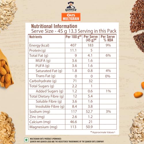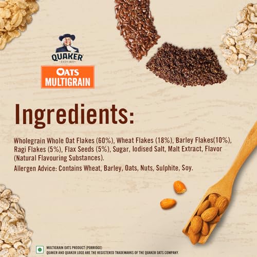 "Start your day with the Power of 5 with Quaker Oats Multigrain!Get the goodness of 5 with Whole Oats Wheat Barley Ragi and Flax Seeds. Quaker Oats Multigrain gives you the energy to do more of what you love. Made with Natural Wholegrain Oats have complex carbohydrates that break down slowly to provide nutritious energy Barley is rich in fiber Ragi for calcium and Flax Seeds as a good source of protein. Multigrain consists of Oats that help maintain weight and support your fitness journey.One serving of Quaker Oats Multigrain (~45g of dry product) provides you with energy equal to 2 Phulkas (Rotis) Fiber equivalent to 1¼ Apples and protein quantity equal to ½ a cup cooked Chana Dal. Get a good start with the benefits of multigrain in a warm bowl of Quaker Oats Multigrain in just 4 minutes. Try it with delicious toppings of fresh or dried fruits nuts or cinnamon. Key benefits: Power of 5 Whole Oats Wheat Barley Ragi and Flax Seeds Made of wholegrain Oats Nutritious Energy High in Fiber that aids Gut Health Source of Protein*Wholegrain Whole Oat Flakes (60%). **Based on 1 serve (45g) of dry product. ***Product is a rich source of fiber (WHO/Wholegrain council). ****Nutrients requirements for Indians 2020. *****Dietary Guidelines for Indians 2011."