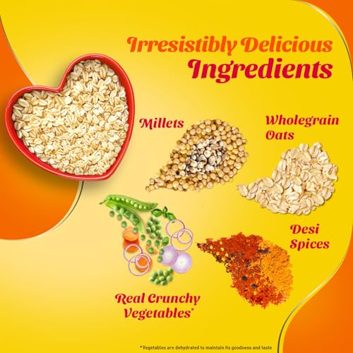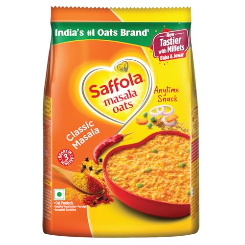 Saffola Masala Oats brings to a range of delightful flavours for a delicious anytime snack. It is made with wholegrain oats real vegetables & chatpata mix of spices to give you a delectable warm bowl of enjoyment that balances out chatpata cravings with health. What's more is that it gets ready to eat in just 3 minutes so that you can enjoy this delicious healthy snacks whenever you want! Devour it as a snack for anytime taste cravings or as a delicious and delightful family breakfast cereal.