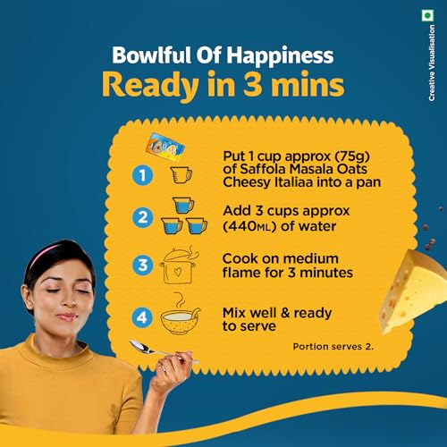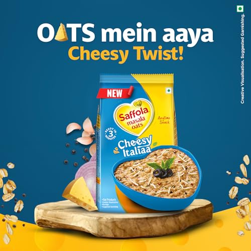 Saffola Masala Oats in a brand new avatar with the indulgent Italian flavoured oats with the perfect mix of cheese & a tasty punch of chilli! Made with real vegetables Saffola Masala Oats Cheesy Italiaa gives you a delightful eating experience teleporting you straight to the flavourful land of Italy! This Saffola Masala Oats pack has bright veggies like corn and green bell pepper Italian herbs and rich Indian Millets like Jowar & Rolled Oats that enhance your consumption experience. Now experience the joy of Italian cuisine at your homes whenever you like without compromising on health.. This is a perfect snack for anytime and anyday. What's more is that it is ready to eat in just 3 minutes - super convenient to make super tasty to eat and super hard to resist! Saffola Masala Oats Cheesy Italiaa is made with wholegrain Oats cheese & real negetables and is high in fibre and protein keeping you fuller for longer helping you control your hunger pangs and manage weight without compromising on taste. Millets one of the oldest crops used traditionally are nutritious & when combined with the goodness of Oats it turns out to be a wholesome food. Moreover cheese with spicy chilli twist make snacking a delightful experience.