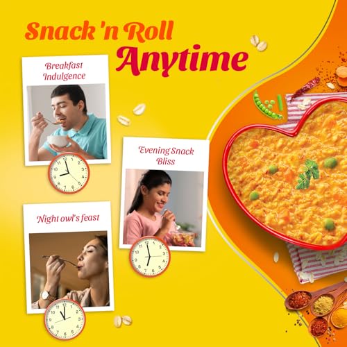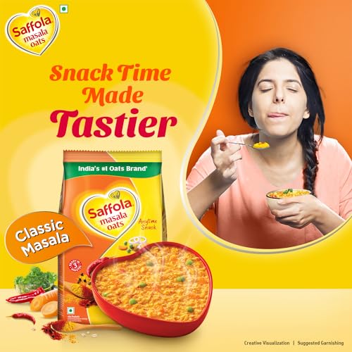 Saffola Masala Oats brings to a range of delightful flavours for a delicious anytime snack. It is made with wholegrain oats real vegetables & chatpata mix of spices to give you a delectable warm bowl of enjoyment that balances out chatpata cravings with health. What's more is that it gets ready to eat in just 3 minutes so that you can enjoy this delicious healthy snacks whenever you want! Devour it as a snack for anytime taste cravings or as a delicious and delightful family breakfast cereal! Available in a range of yummy flavours - Classic Masala : for the classic masaledar experience | Veggie Twist: for the comforting blend of spices and vegetables | Peppy tomato: for a tangy indulgence | Masala Coriander: for the aromatic coriander flavour. Order your pack of this delicious healthy snack today and say bye to your chatpata cravings! Did you know? Saffola Masala Oats is made with wholegrain oats a cereal that is high in fibre and in protein which keep you fuller for longer controls your hunger pangs and thereby helps you manage weight.