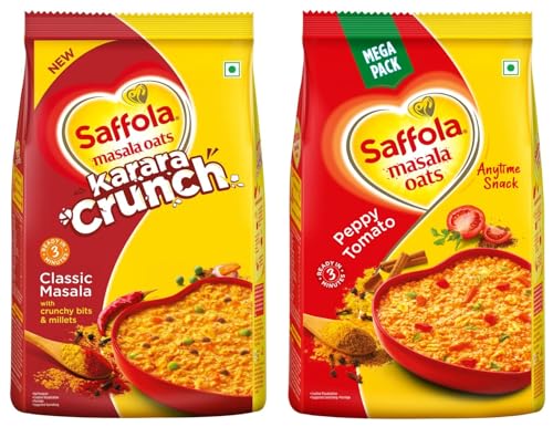 Saffola Masala Oats Karara Crunch Tasty Evening Snack Classic Masala with Crunchy Bits and Millets 500gNow enjoy Saffola Masala Oats in a crunchy avatar! With the addition of crunchy bits and millets Saffola Masala Oats Karara Crunch gives you a crunch-filled delight in every bite! This Saffola Masala Oats pack has Crunchy balls (made of multigrain and masalas) and rich Indian Millets (Jowar Bajra and Ragi) that enhance your consumption experience. Together the authentic desi spices along with addition of crunchy bits crispy veggies and millets bring you a mouth-watering masaaledar flavour and karara crunch in every bite. What's more is that it is ready to eat in just 3 minutes - super convenient to make super tasty to eat and super hard to resist! Saffola Masala Oats Karara Crunch is available in Classic Masala flavour for the epic masaledar chatpata experience. Made with wholegrain Oats & real vegetables Saffola Masala Oats is high in fibre and protein keeping you fuller for longer helping you control your hunger pangs and manage weight. Millets one of the oldest crops used traditionally are nutritious & when combined with the goodness of Oats it turns out to be a wholesome food. Moreover real vegetables & crunchy bites make snacking a delightful experience.Saffola Masala Oats | Tasty Evening Snack| Healthy Snack| Peppy Tomato| 500gSaffola Masala Oats brings to you a range of delightful flavours making for a perfect evening snack. Made with wholegrain oats real vegetables & a tasty mix of authentic desi spices Saffola Masala Oats forms a delectable warm bowl of joy. What's more is that it is ready to eat in just 3 minutes - super convenient to make super tasty to eat and super hard to resist! You can also enjoy Saffola Masala Oats in a variety of tasty recipes like Crispy Cutlets Penne Pasta or just as a delicious bowl of joy with crunchy topping like namkeen peanuts or crushed papad. Saffola Masala Oats is available in a range of lip-smacking flavours - Classic Masala for the classic masaledar experience | Veggie Twist for the comforting blend of spices and vegetables | Peppy tomato for a tangy indulgence | Masala Coriander for the tasty mix of desi spices with coriander notes | Curry & Pepper with a lingering aroma of curry leaves. Made with wholegrain Oats & real vegetables Saffola Masala Oats is high in fibre and protein keeping you fuller for longer helping you control your hunger pangs and manage weight.