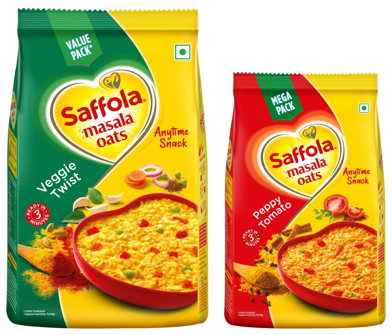Saffola Masala Oats | Tasty Evening Snack| Healthy Snack| Veggie Twist| 1KgSaffola Masala Oats brings to you a range of delightful flavours making for a perfect evening snack. Made with wholegrain oats real vegetables & a tasty mix of authentic desi spices Saffola Masala Oats forms a delectable warm bowl of joy. What's more is that it is ready to eat in just 3 minutes - super convenient to make super tasty to eat and super hard to resist! You can also enjoy Saffola Masala Oats in a variety of tasty recipes like Crispy Cutlets Penne Pasta or just as a delicious bowl of joy with crunchy topping like namkeen peanuts or crushed papad. Saffola Masala Oats is available in a range of lip-smacking flavours - Classic Masala for the classic masaledar experience | Veggie Twist for the comforting blend of spices and vegetables | Peppy tomato for a tangy indulgence | Masala Coriander for the tasty mix of desi spices with coriander notes | Curry & Pepper with a lingering aroma of curry leaves. Made with wholegrain Oats & real vegetables Saffola Masala Oats is high in fibre and protein keeping you fuller for longer helping you control your hunger pangs and manage weight.Saffola Masala Oats | Tasty Evening Snack| Healthy Snack| Peppy Tomato| 500gSaffola Masala Oats brings to you a range of delightful flavours making for a perfect evening snack. Made with wholegrain oats real vegetables & a tasty mix of authentic desi spices Saffola Masala Oats forms a delectable warm bowl of joy. What's more is that it is ready to eat in just 3 minutes - super convenient to make super tasty to eat and super hard to resist! You can also enjoy Saffola Masala Oats in a variety of tasty recipes like Crispy Cutlets Penne Pasta or just as a delicious bowl of joy with crunchy topping like namkeen peanuts or crushed papad. Saffola Masala Oats is available in a range of lip-smacking flavours - Classic Masala for the classic masaledar experience | Veggie Twist for the comforting blend of spices and vegetables | Peppy tomato for a tangy indulgence | Masala Coriander for the tasty mix of desi spices with coriander notes | Curry & Pepper with a lingering aroma of curry leaves. Made with wholegrain Oats & real vegetables Saffola Masala Oats is high in fibre and protein keeping you fuller for longer helping you control your hunger pangs and manage weight.