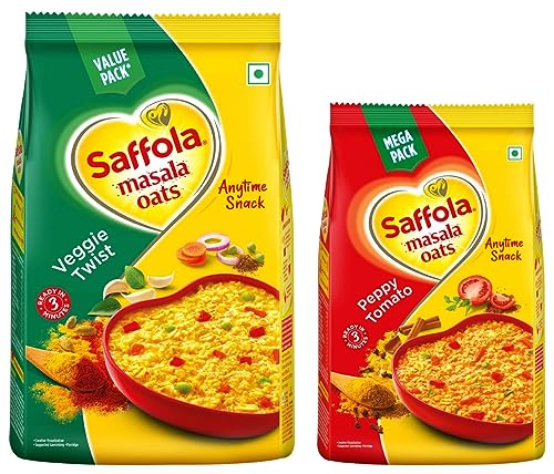 • Product 1: Veggie Twist from Saffola Masala Oats has a rich and creamy blend of aromatic spices with a crunchy mix of carrots peas and french beans