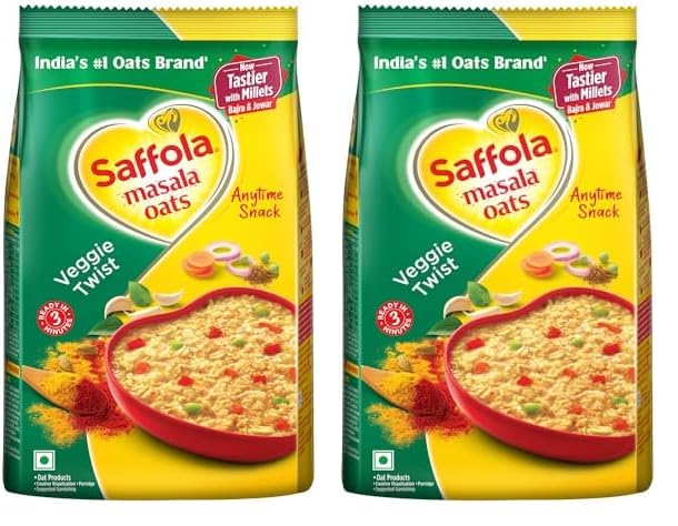 Saffola Masala Oats |Veggie Twist | Tasty Anytime Snack | Ready in 3 mins | Millets Goodness- with Bajra & Jowar | No maida No added preservatives | Oats helps manage weight |500g (Pack of 2)