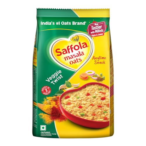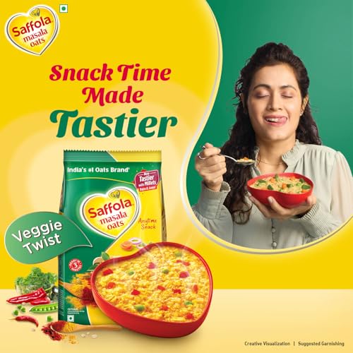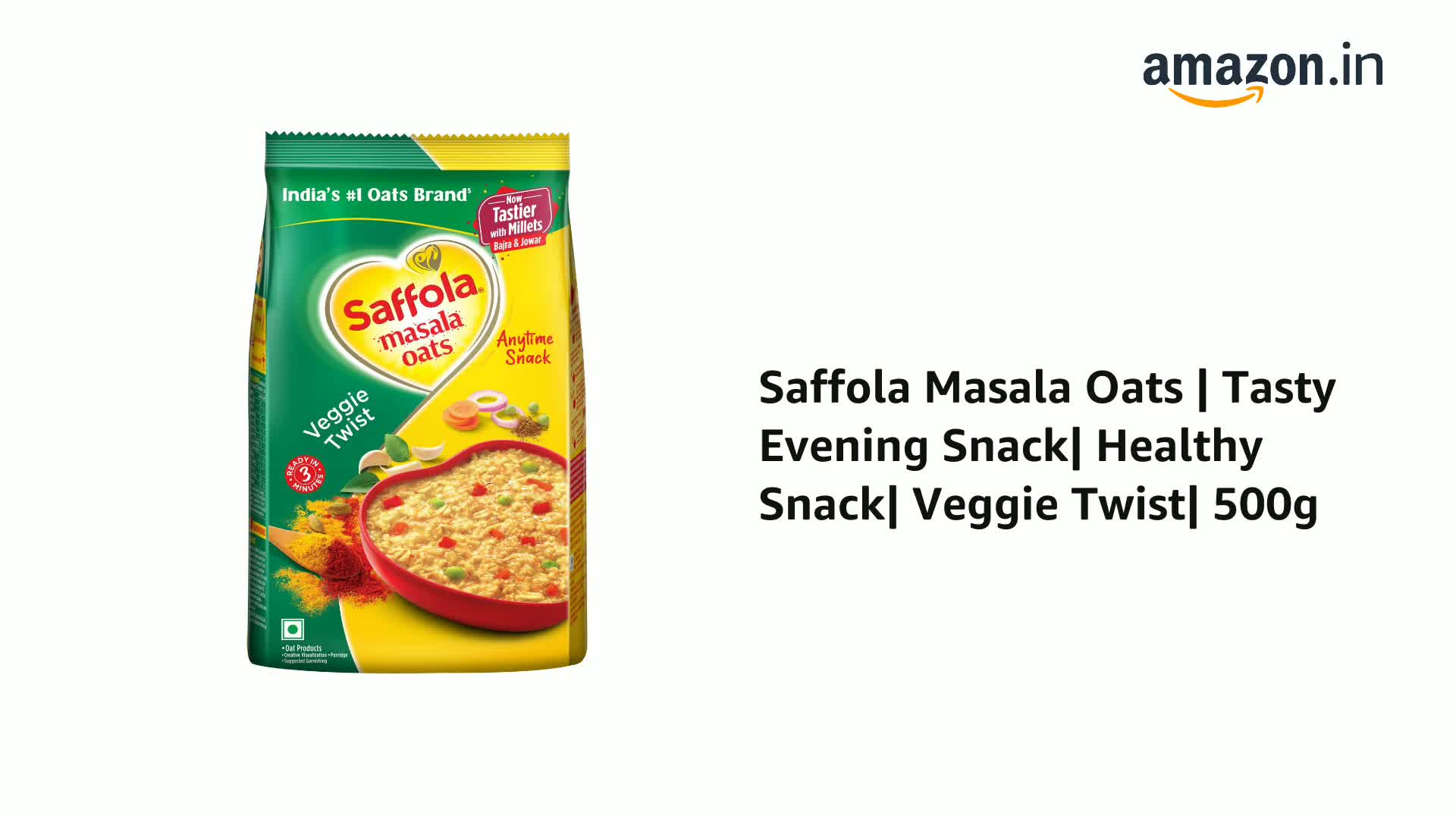 Saffola Masala Oats brings to you a range of delightful flavours making for a perfect evening snack. Made with wholegrain oats real vegetables & a tasty mix of authentic desi spices Saffola Masala Oats forms a delectable warm bowl of joy. What's more is that it is ready to eat in just 3 minutes - super convenient to make super tasty to eat and super hard to resist! You can also enjoy Saffola Masala Oats in a variety of tasty recipes like Crispy Cutlets Penne Pasta or just as a delicious bowl of joy with crunchy topping like namkeen peanuts or crushed papad. Saffola Masala Oats is available in a range of lip-smacking flavours - Classic Masala for the classic masaledar experience | Veggie Twist for the comforting blend of spices and vegetables | Peppy tomato for a tangy indulgence | Masala Coriander for the tasty mix of desi spices with coriander notes | Curry & Pepper with a lingering aroma of curry leaves. Made with wholegrain Oats & real vegetables Saffola Masala Oats is high in fibre and protein keeping you fuller for longer helping you control your hunger pangs and manage weight.