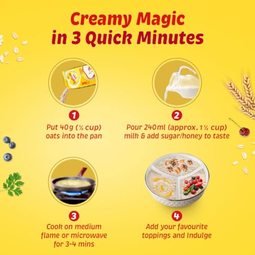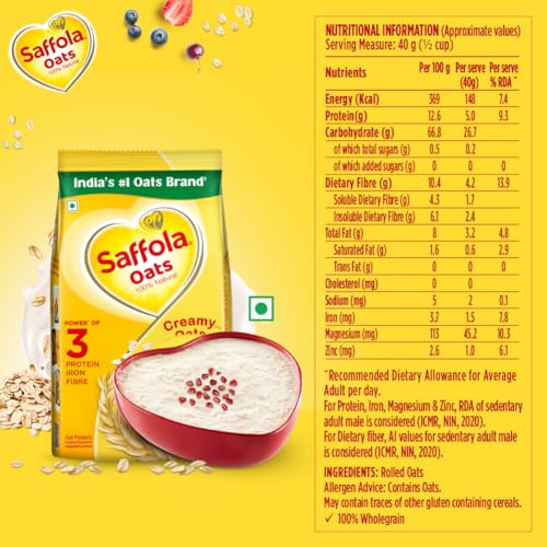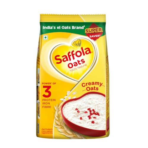 Saffola Oats are made with 100% natural wholegrain rolled oats. Its grains are so soft that it provides a super creamy texture to your breakfast. Porridge prepared by Saffola Oats is so creamy that it melts in your mouth. Relish a quick bowl of Saffola Oats by simply adding your favorite toppings like fruits honey syrup etc. Ready in 3 minutes; Saffola Oats can be had as a hot bowl of oats or a yummy cold dessert. Apart from porridge you can also try other lip-smacking recipes like Oats Upma Uttapam Daliya Smoothies etc. as these soft grains blend easily into your recipes. Packed with the Power of 3 Protein Fiber and Iron; Saffola Oats ensures you get nutrition packed breakfast. The high fiber content keeps you fuller for longer and provides long-lasting energy suitable for today active lifestyle. Available in 200g 400g 500g 1kg & 1.4kg pack sizes Also try our delicious range of Saffola Masala Oats flavours - Classic Masala: for the classic masaledaar experience | Veggie Twist: for the comforting blend of spices and vegetables | Peppy tomato: for a tangy indulgence | Masala Coriander: for the aromatic coriander flavour. Order your pack of this delicious healthy snack today and say bye to your chatpata cravings!