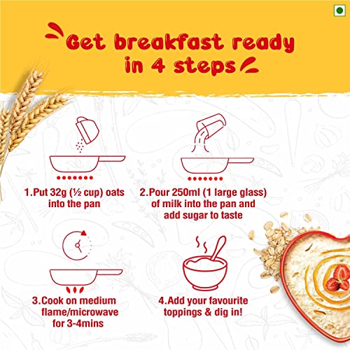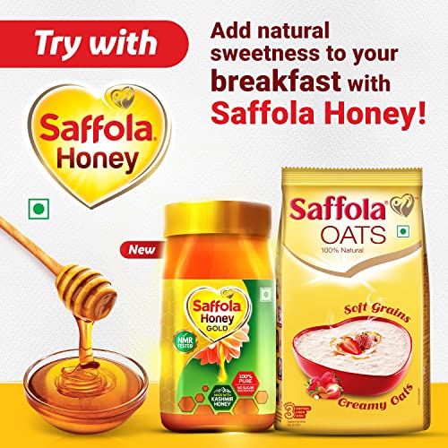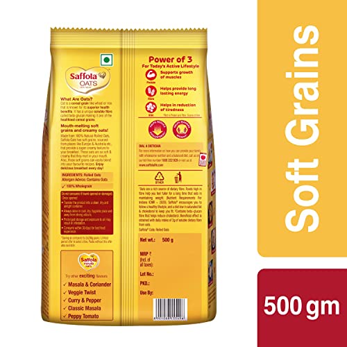 Saffola Oats are made with 100% natural wholegrain rolled oats. Its grains are so soft that it provides a super creamy texture to your breakfast. Porridge prepared by Saffola Oats is so creamy that it melts in your mouth. Relish a quick bowl of Saffola Oats by simply adding your favorite toppings like fruits honey syrup etc. Ready in 3 minutes; Saffola Oats can be had as a hot bowl of oats or a yummy cold dessert. Apart from porridge you can also try other lip-smacking recipes like Oats Upma Uttapam Daliya Smoothies etc. as these soft grains blend easily into your recipes. Packed with the Power of 3 Protein Fiber and Iron; Saffola Oats ensures you get nutrition packed breakfast. The high fiber content keeps you fuller for longer and provides long-lasting energy suitable for today's active lifestyle. Available in 200g 400g 500g 1kg & 1.4kg pack sizes Also try our delicious range of Saffola Masala Oats flavours - Classic Masala: for the classic masaledaar experience | Veggie Twist: for the comforting blend of spices and vegetables | Peppy tomato: for a tangy indulgence | Masala Coriander: for the aromatic coriander flavour. Order your pack of this delicious healthy snack today and say bye to your chatpata cravings!