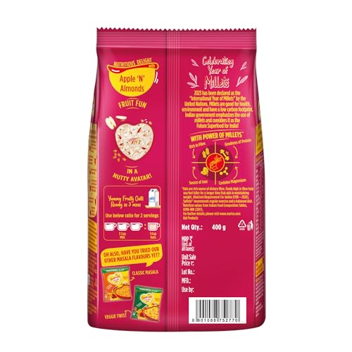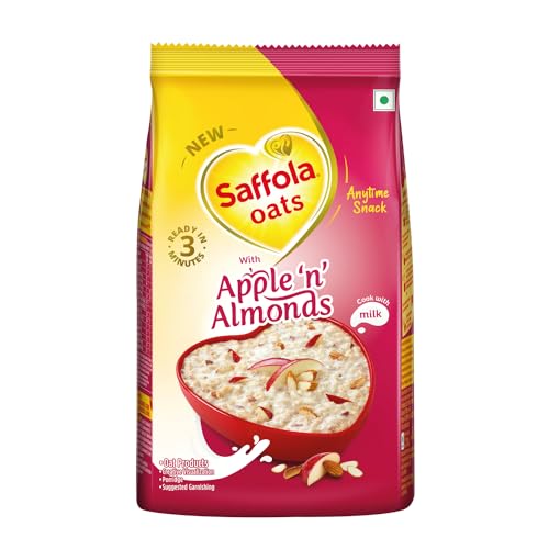 Saffola Oats in a brand new avatar with the indulgent fruity flavoured oats mixed with real nuts! Made with real fruits & nuts Saffola Oats with Apple 'n' Almonds gives you a delightful eating experience. This Saffola Oats pack has bright fruits like apple slices and tasty almonds. Along with this rich Indian Millets like Jowar & Rolled Oats are also present that enhance your consumption experience. Now experience the joy of sweet & fruity oats at your homes whenever you like without compromising on health.. This is a perfect snack for anytime and anyday. Just cook it in milk and it is ready to eat in just 3 minutes - super convenient to make super tasty to eat and super hard to resist! Saffola Oats with Apple 'n' Almonds is made with wholegrain Oats apple slices almonds and the warm touch of cinnamon. It is high in fibre and protein and keeps you fuller for longer helping you control your hunger pangs and manage weight without compromising on taste. Millets one of the oldest crops used traditionally are nutritious & when combined with the goodness of Oats it turns out to be a wholesome food. Moreover a nutritious fruity delight in a nutty avatar makes snacking a delightful experience.