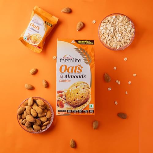 Sunfeast Farmlite digestive oats provides the goodness of oats as healthy & tasty biscuits. These health-filled biscuits have high oats content are made from aashirvaad atta and are available in 3 tasty variants â almonds raisins & chocolate. You can feel the dash of almonds and crunchy oats in every bite of this healthy and tasty delight. Sunfeast Farmlite biscuits is the only health biscuit range in the world that is: made from aashirvaad atta| no maida | no trans fat |no cholesterol.