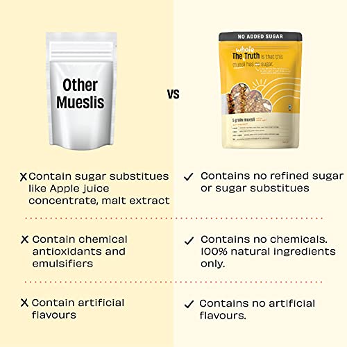 Whatthe perfect breakfast? It gets you started On everything! Protein carbs good fats natural fibers vitamins minerals - it should get your dayticker rolling on all fronts. It keeps you up. Ever felt like plonking right back into bed after breakfast? Itnot you¦itthe simple carbs (and refined sugars) leading to an insulin surge. It keeps you going Breakfast should get you to lunch. If it fizzles out midway (and your energy crashes by noon) itbecause the energy release was fast and spiky. Not slow and steady. We crafted these Mueslis to tick all those boxes and more. Herehow: Balanced Macros: Unlike traditional breakfast cereals that are loaded with carbs (and little else) only half the energy here comes from carbs. And the other half from good fats & proteins. Sustained Energy: Majority of the carbs are complex slow-release carbs from whole grains. Which means steady energy release that gets you through the day. Insulin Impact: The complex carbs and natural fibres help avoid a sudden insulin surge. No spikes and crashes. No refined sugar: Sugar ain't bad. Refined nutritionally empty sugar is. So to sweeten this Muesli we found Kakvi. A dark golden liquid used for ages in rural coastal India - itthe most un-refined form of sugarcane you can find. And iteven more nutritious than jaggery! Portion controlled: The real problem with a sugary breakfast cereal is how much we eat of it. Both as breakfast and generally - as a snack. Thatwhy we send you a measuring scoop. 2 scoops = 1 serving = ~220 calories. Another 120cal from 200ml milk - and your morning is sorted under 350cal! But no cheating ok!