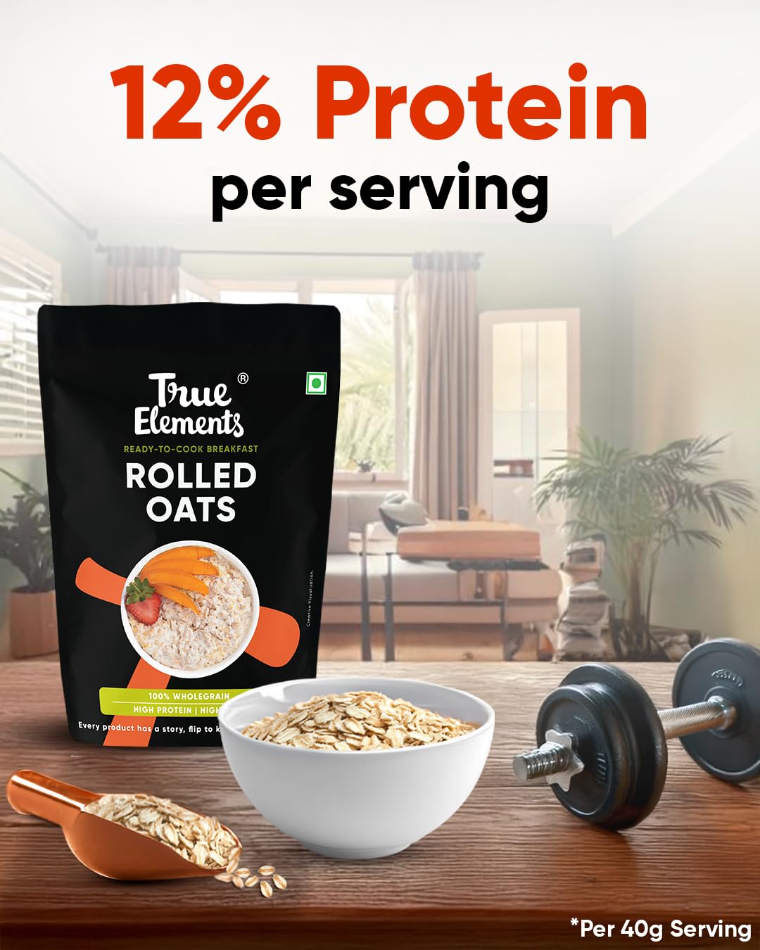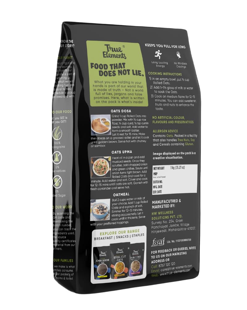 Discover True Elements Rolled Oats a genuine and high-protein breakfast cereal perfect for adults. With a serving size of 1/2 cup of rolled oats this product offers a slow and steady energy release promoting heart health digestive wellness and blood sugar regulation. These oats are 100% rolled maintaining quality and delivering a delightful mouthfeel unlike other so-called 'instant' oats. Rich in dietary fiber insoluble fiber and soluble fiber these rolled oats are also high in starch and low in fat making them an excellent choice for a balanced diet. Enjoy the taste and texture of these oats with milk or water adding sweeteners fruits or nuts to enhance the flavor. The product comes in a 1 kg bag with 1.01 kg item package weight and is manufactured by HW Wellness Solutions Pvt Ltd in India. Experience the True Elements Rolled Oats difference and redefine your breakfast today.