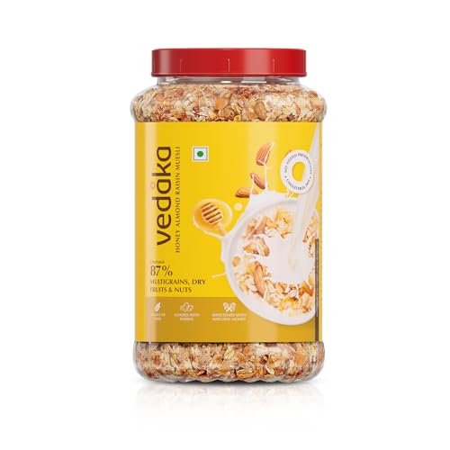Introducing the Amazon Brand Solimo Honey Almond Raisin 1 kg. The muesli is packed with the goodness of 87% Dry Fruits Nuts and Multigrains for a delicious meal. The muesli is also a source of fiber naturally cholesterol-free and low in saturated fat. The muesli comes with a resealable jar to ensure that the product can be stored easily. It can be had with milk yogurt or even with dry fruits to make for a delicious breakfast. Further it makes for a great on-the-go snack.