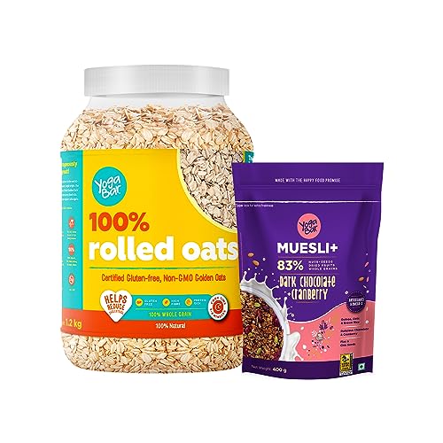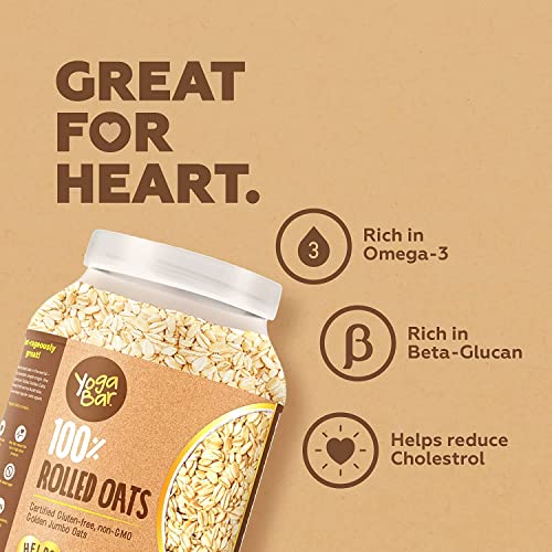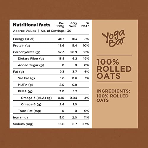 Forget everything you know about Oats. Yogabar Super Oats is different. This is Oats - like never before. That's why we call it golden rolled oats. No Fillers no preservatives nothing artificial. Great for your Heart great for weight management. We can go on but we're running out of space. Pick us up? You're going for gold. Why Choose Yogabar 100% Golden Rolled Oats? Certified Premium Gluten Free Oats. High Fibre No Added Sugar 100% Wholegrains. Goodness of rolled oats - rich source of protein dietary fiber and vitamins & minerals. Preparation Time: With a mere preparation time of 5 minutes YogaBarâs instant oats are the ideal for a quick wholesome meal! Yogabar Oats Contains: Beta Glucan fibre that may help reduce Cholesterol. May help reduce the risk of high blood pressure. An adequate source of protein. Rich source of dietary fibre that helps manage weight. No Preservatives processed - Sugar free oats. Non-GMO No Maltodextrin. Benefits of Yogabar Oats: With high dietary fiber and no added sugar Yogabar oats maybe ideal for weight loss. Cook time of only 5 mins - quick yet delicious high protein oatmeal to start your day right! How to use? Add oats to water and milk in a saucepan and cook for 3-5 minutes. Add your favorite veggies nuts & seeds for a flavor boost. Looking for a protein packed breakfast for your whole family? Add a spoonful of Yogabar Peanut Butter! Ideal for your next baking task - Oat Biscuits! With no added preservatives or additional sugar- making it a healthy breakfast for the entire family! Lookout for our other flavors - Veggies Masala Oats Dark Chocolate Cheesy Masala Dal Khichdi and Nuts & Seeds. Also coming up in Oats 1kg packs and Oats 2kg packs.