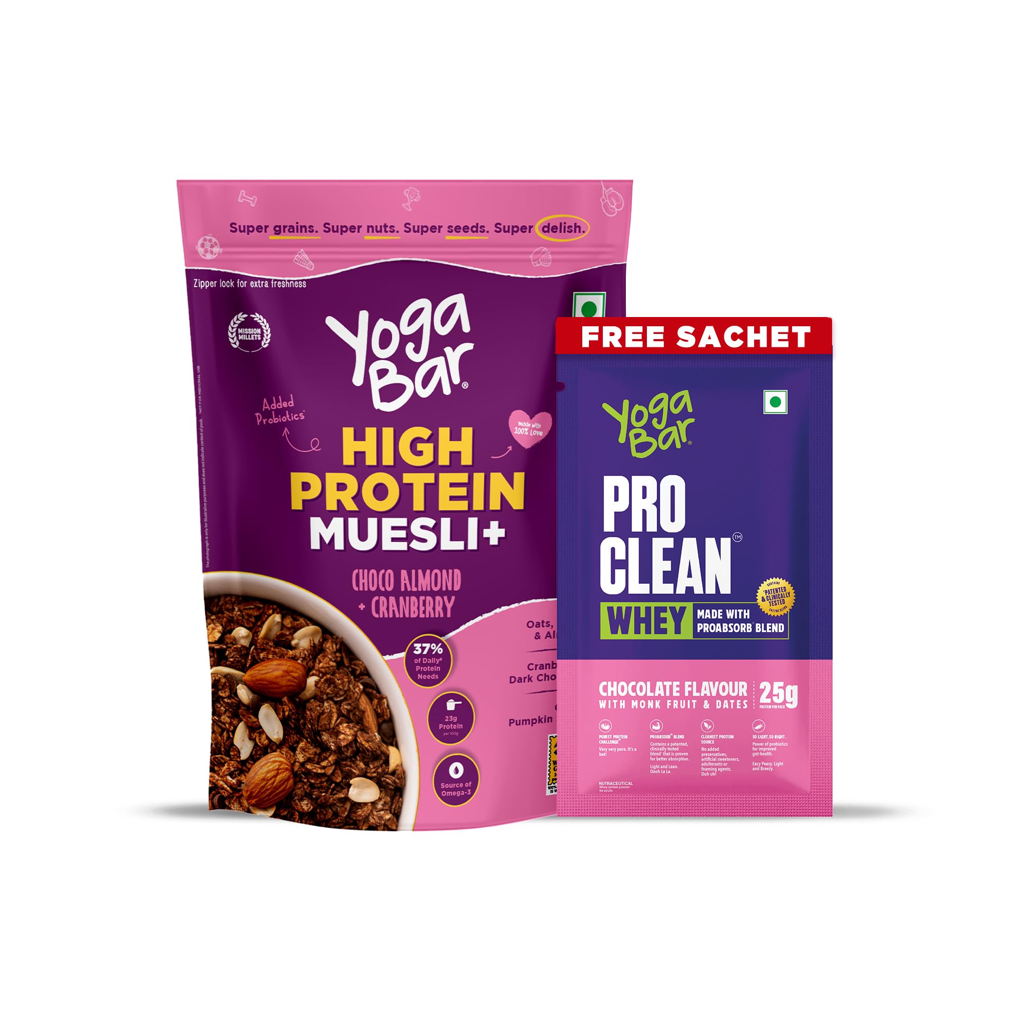 Yogabar High Protein Muesli Plus Choco Almond and Cranberry 850g Pack with Pro Clean Whey 35g Pack