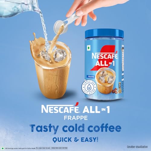 JUST ADD COLD WATER! Experience the ultimate convenience and indulgence with NESCAFE All In 1 Frappe Instant Cold Coffee Mix Powder. This premix offers rich and creamy coffee goodness and is a quick and effortless way to enjoy a refreshing cold coffee anytime anywhere. Simply add cold water stir and enjoy a refreshing glass! NESCAFE All In 1 Frappe's convenient jar packaging with a serving scoop offers you the flexibility to make your favorite cold coffee in your own way. It's perfect for any moment and ensures consistent taste and quality in every sip!Method of Preparation: Step 1 - Pour 180 ml cold water in a glass. Step 2 - Add 2 Scoops (approx. 28g) of premix into the cold water. Step 3 - Stir well until completely dissolved. Step 4 -Enjoy a delicious glass of NESCAFE All in 1 Frappe. Storage Instructions: Store in a cool dry & hygienic place. Use clean and dry scoop/spoon for using the product. Consume within 25 days of opening the inner pouch.