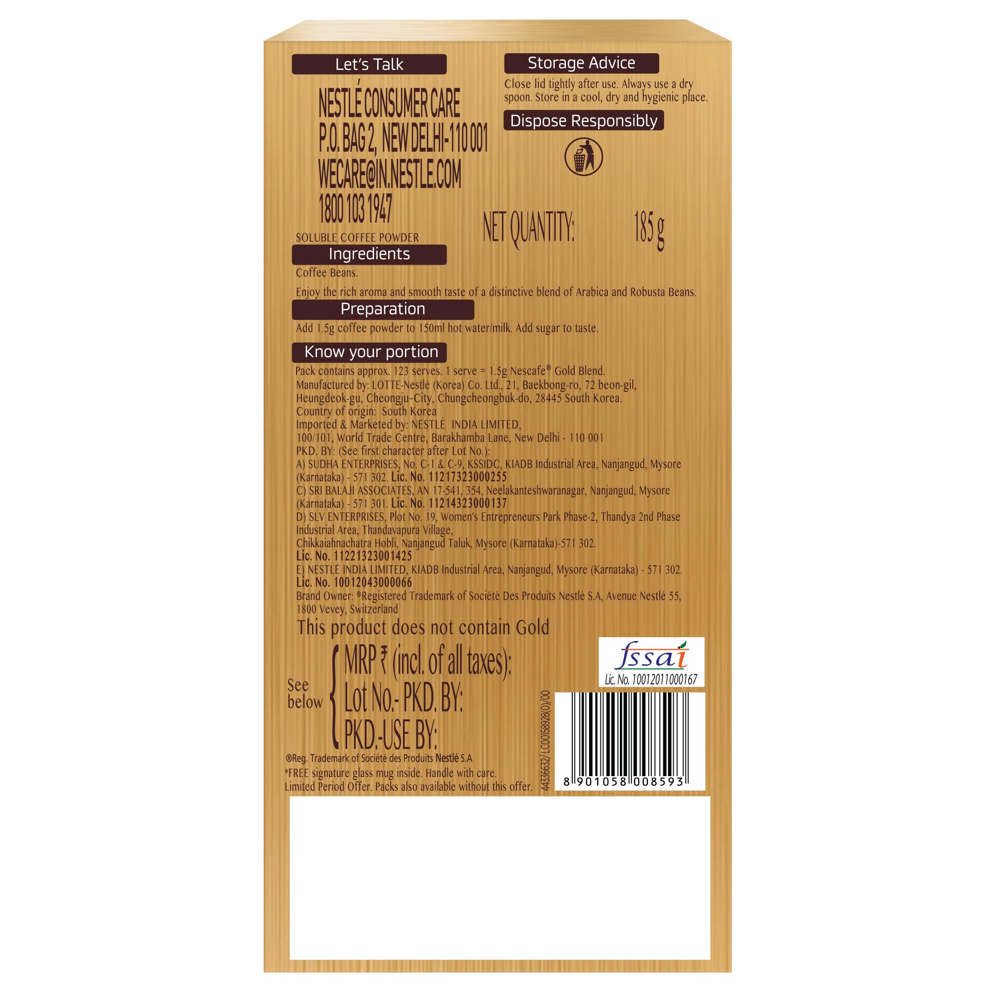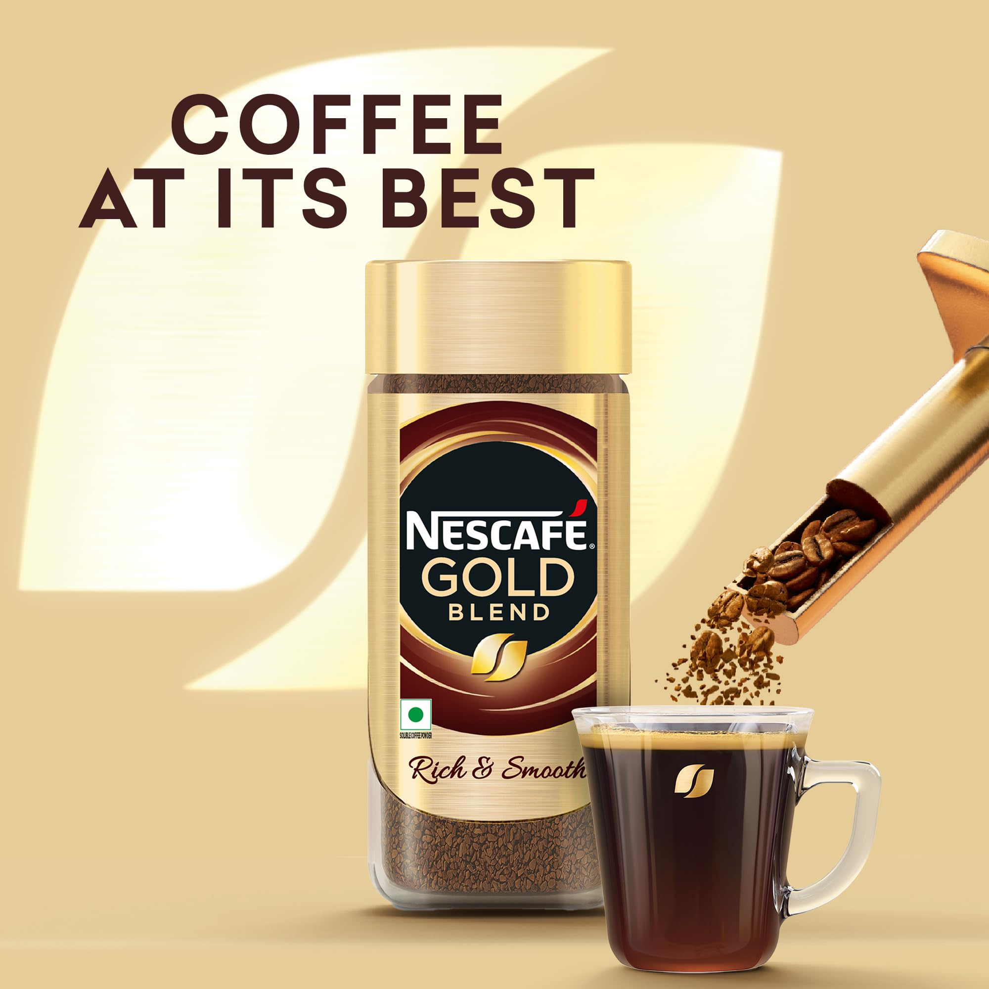NESCAFE brings you Coffee at its Best rising above all to the highest standards set by coffee connoisseurs. This premium imported instant coffee roast is artfully crafted to achieve a quality coffee experience. NESCAFE Gold coffee is a sophisticated aromatic coffee with a rich well-rounded taste. This instant coffee powder is made using carefully selected Arabica and Robusta beans roasted by experts to bring out their natural flavor. Our freeze-dried technology then captures the rich coffee aroma in every granule to bring you a sophisticated coffee experience in every sip. NESCAFE's commitment to quality goes well beyond the product. NESCAFE helps the coffee farmers and minimize environmental impact at every step. Usage: Prepare with boiling milk or water. Add sugar to taste. Storage: Store the product in a cool dry and hygienic place. To ensure lasting freshness close the lid tightly after every use. Always use a dry spoon.