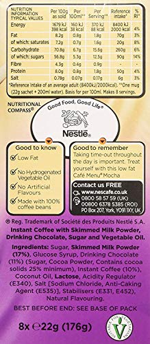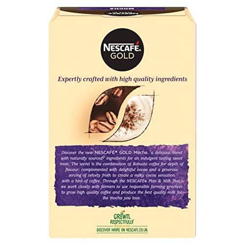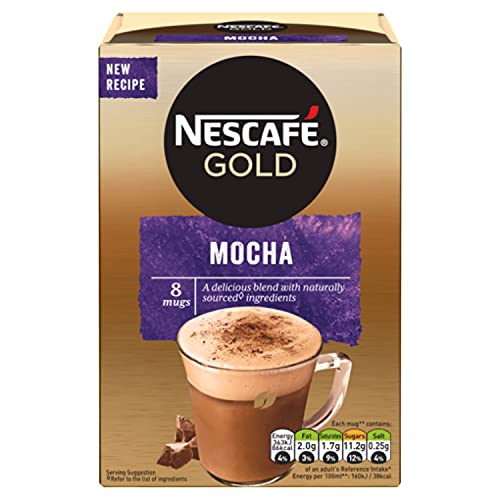 Nescafe gold mocha combines rich-tasting drinking chocolate with full-flavoured coffee beans. Prepare your drink with ease and enjoy a coffee shop-style mocha whenever you fancy it whether you're at home or you're taking a break from your working day. Our convenient mocha sachets make it easy to instantly transform your coffee break into something special morning noon or night.