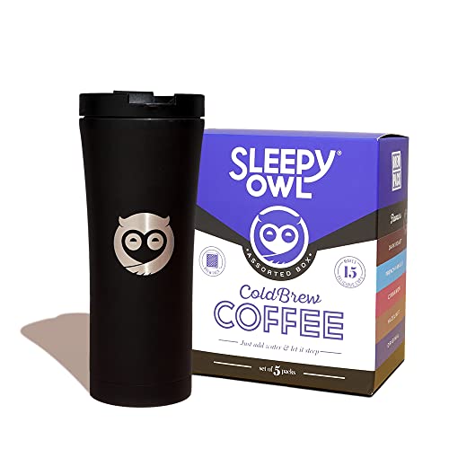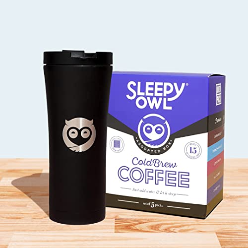 Sleepy Owl Assorted Cold Brew Travel Kit | Cold Brew & Travel Mug | 5 Flavours | Makes 15 Cups | Cold Brew Coffee | 3 Step Brew - No Equipment Required | 100% Arabica Beans