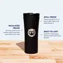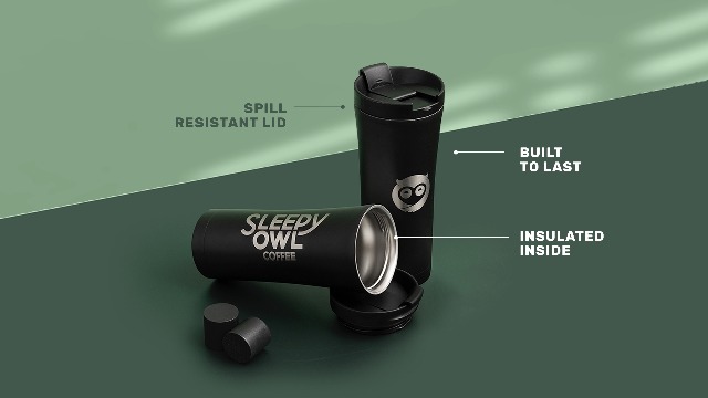 CAFFEINATE IN STYLE Made to be on the road with you. This spill-proof mug is ideal for both hot & cold coffee thanks to its stainless steel structure. Holds 480ml of liquid.