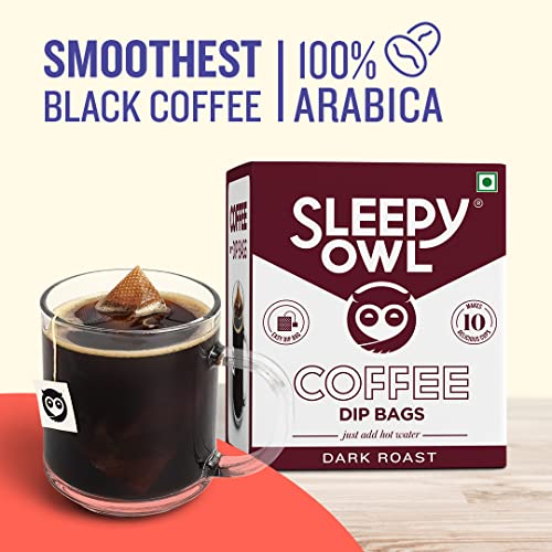 Sleepy Owl Dark Roast Ground Coffee Dip Bags | 10 Bags - Makes 10 Cups | Hot Brew - Have it as Black Coffee or With Milk | 5 Min Brew - No Equipment Needed | Travel Pack | Medium Roast | 100% Arabica