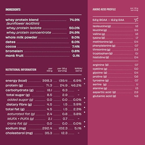 Made with whey isolate whey concentrate cocoa milk dates monk fruit bromelain and sunflower lecithin. That all!