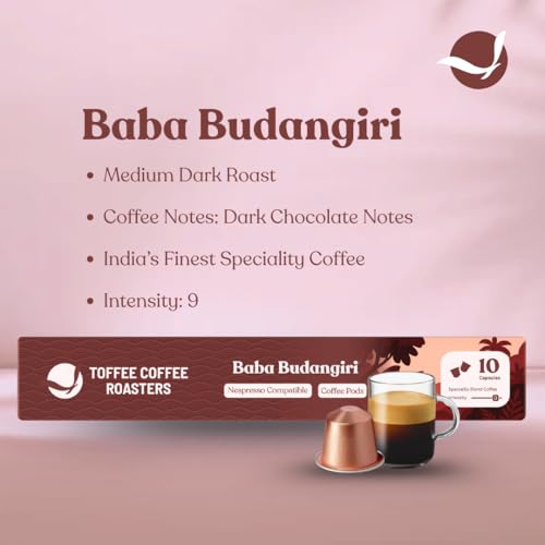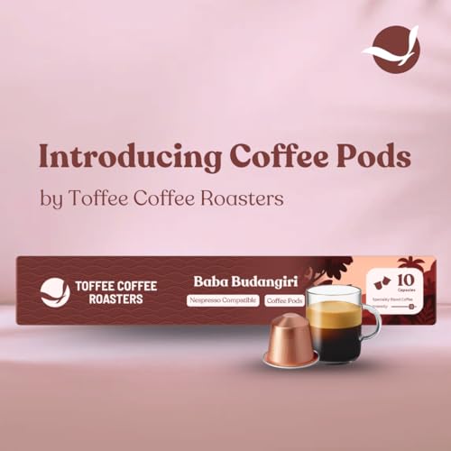 Toffee Coffee Roasters | Baba Budangiri Coffee Capsules | Nespresso Compatible Pods| 100% Speciality Grade | Notes: Nutty & Chocolaty | Roast: Medium Dark | Pack of 4 (40 Capsules) |