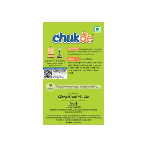 Introducing Jal Jeera Masala by Chukde a popular spice blend in India that is commonly used to flavor drinks snacks and me. This 100 gm pack contains a blend of iodized salt black salt dry mango slices cumin tamarind mint leaves citric acid dry ginger yellow chilli black pepper clove turmeric and asafoetida.One of the advantages of using Jal Jeera Masala is its benefits. It contains cumin coriander ginger and other spices that can help to promote bloating and and alleviate . itionally the cooling effect of Jal Jeera Masala due to the presence of mint and other cooling spices can help to cool the body and making it a popular drink during hot summers.Jal Jeera Masala o s a delicious and unique flavor to drinks snacks and memaking it a popular choice for those who enjoy spicy and tangy flavors. Furthermore some of the spices in Jal Jeera Masala such as cumin and coriander contain antiand other beneficial compounds that can help to improve overall health and well-being.This versatile spice blend can be used in a variety of ways including as a spice blend for cooking a seasoning for snacks or a flavoring for drinks like lemonade and soda. Rest assured that this product is laboratory tested and hygienically packed and contains no artificial colors.