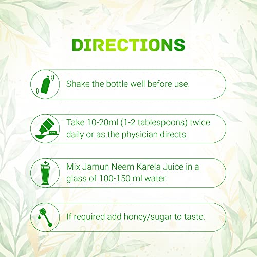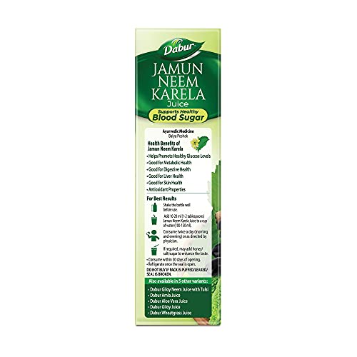 Dabur Jamun Neem Karela Juice combines the health benefits of Jamun and Karela Fruits with Neem leaves to help keep up healthy levels of blood sugar. It is an immunity booster which helps promote healthy glucose levels. It not just helps boost the metabolism but also aids for a healthy weight and is good for your digestive system. It also has antioxidant properties helps stimulate immune functions and aids in digestion. It is good for liver & skin health too. It is 100% Ayurvedic Pure Natural & Safe free from Synthetic Colours and flavours. Dabur Jamun Neem Karela Juice is part of Daburs Ayurvedic Health Juices range with other variants being Dabur Amla Juice Dabur Giloy Juice Dabur Aloe Vera Juice and Dabur Giloy Neem Tulsi Juice. All of these variants with their key Ayurvedic ingredients are excellent immunity boosters 100% Ayurvedic free from synthetic flavour & colour completely Pure Natural & Safe.