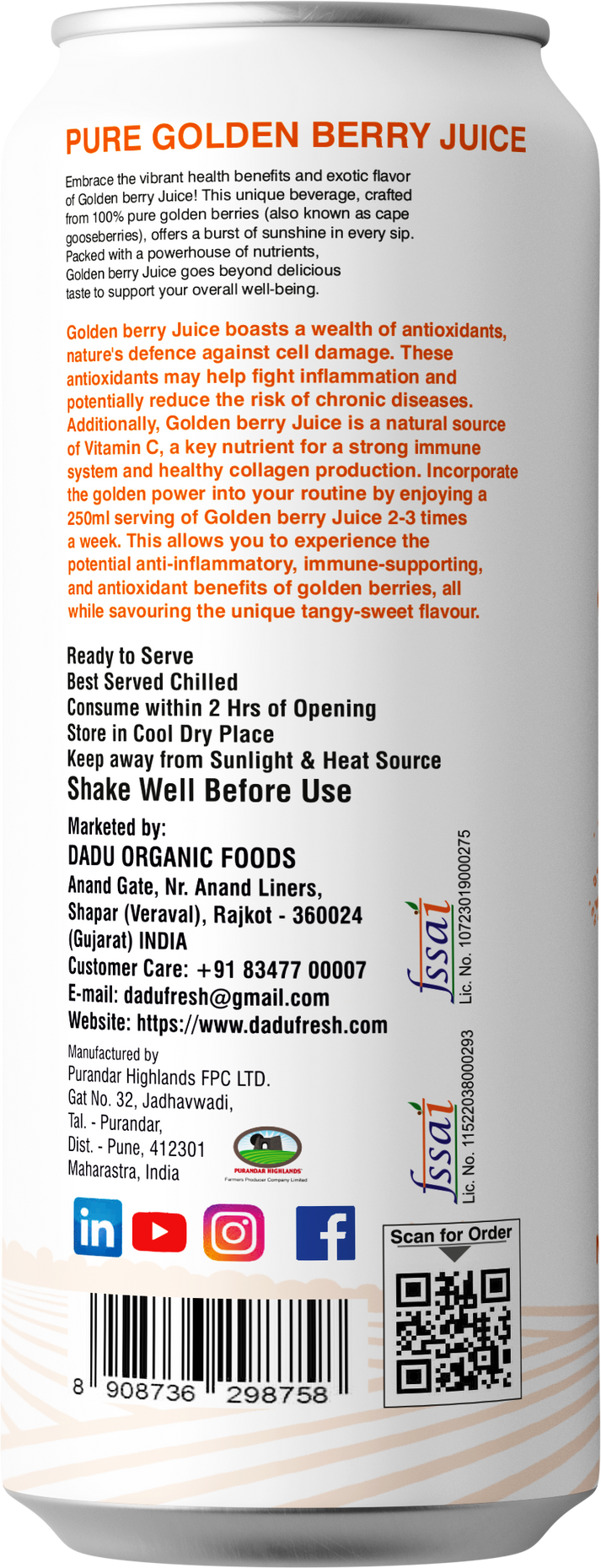 Pure Golden Berry Juice - A Burst of Ancient Goodness in Every SipIndulge in the exotic taste and remarkable health benefits of Dadu Fresh's Pure Golden Berry Juice. Sourced from the golden treasures of the Andes, this exquisite elixir offers a unique flavor profile and a potent dose of essential nutrients.