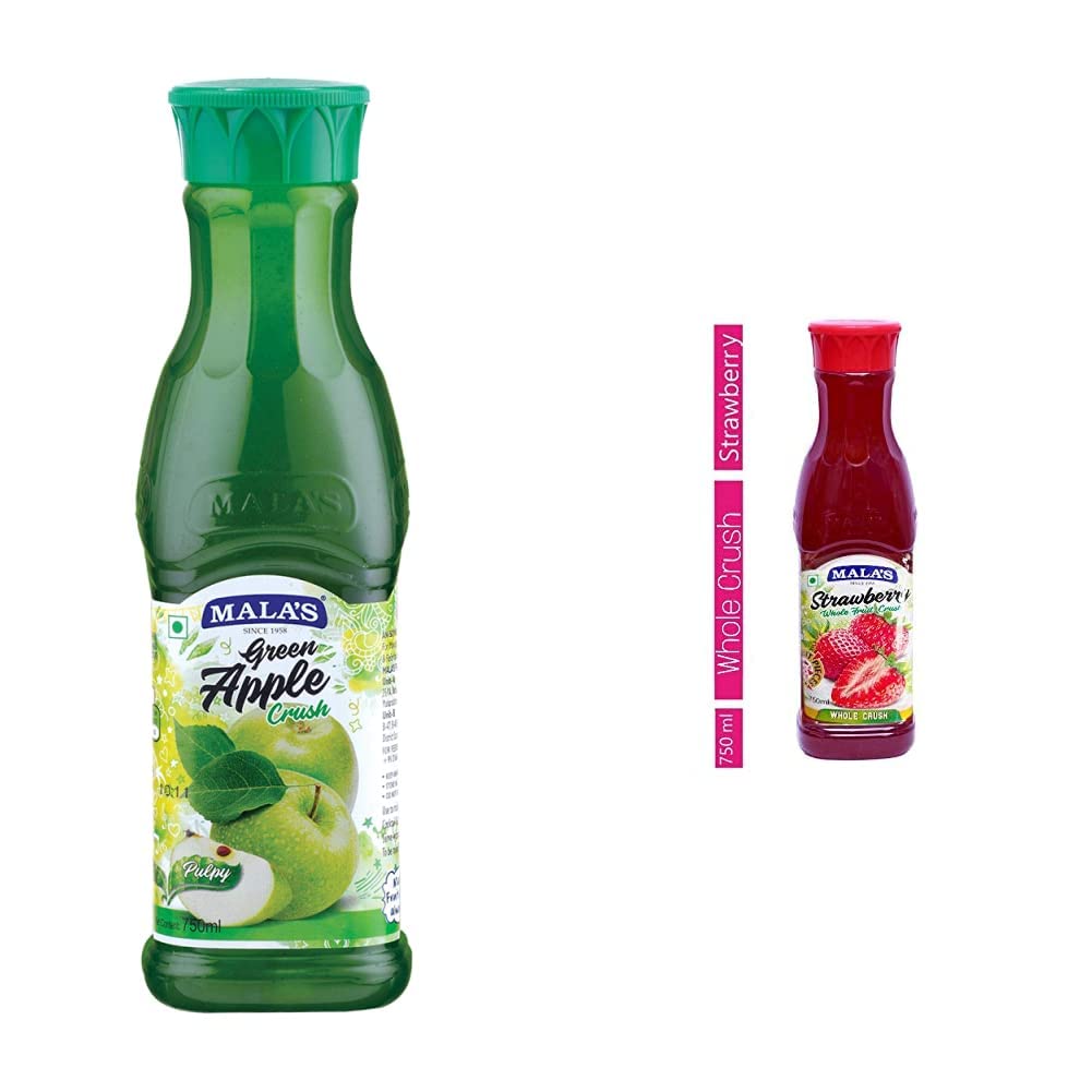 Mala's Fruit Crush Green Apple 750ml 1 CountEmerald green and tangy sweet this green apple variety is packed with crisp tart flavour. Mala's Green Apple Crush is having this perfect balance between sweetness and a slight acidic touch. Mala's Green Apple makes delicious Milkshakes Desserts Ice-Creams Smoothies . use as a topping for Ice-cream and desserts.Mala's Whole Fruit Crush - Strawberry 750ml 1 countMala's A summer time favourite Juicy bright happiness fruit with its deep red colour and thick pulpiness with just the right amount of sweetness you can enjoy the sensation of summer all year long with our bottled with love Mala's Strawberry Crush. Add the strawberriness to your delicious milkshakes thickshakes ice-creams smoothies. Use as Dessert Toppings to pour on your desserts and sundaes.