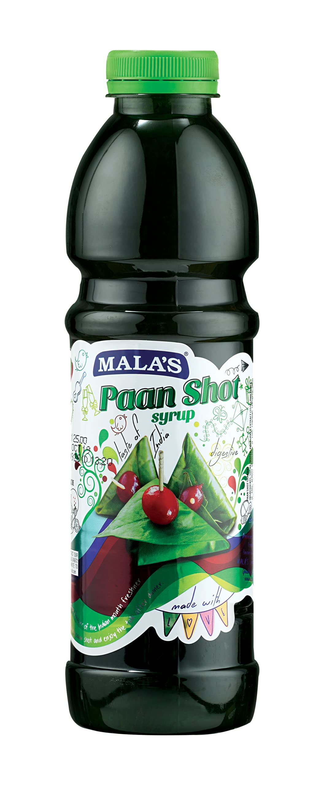 Paan also called betel quid an Indian after-dinner treat Now enjoy in syrup form with Mala's paan shot a traditional strong flavourful taste associated with India. A festive flavour associated with a robust strong flavour. Mala's paan shot when you blend in to make your sherbats mock tails cocktails sodas sorbets iced tea lemonades and specialty beverages. Have a paan in your glass after the meals. Make a creative drink.