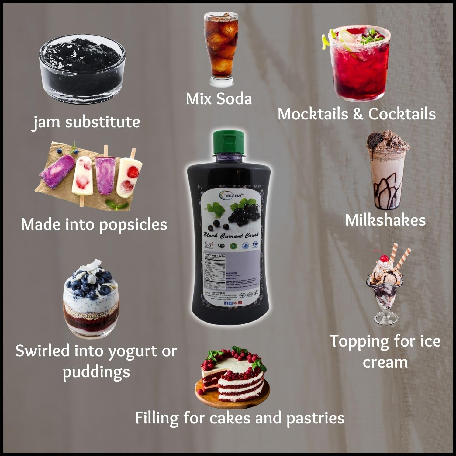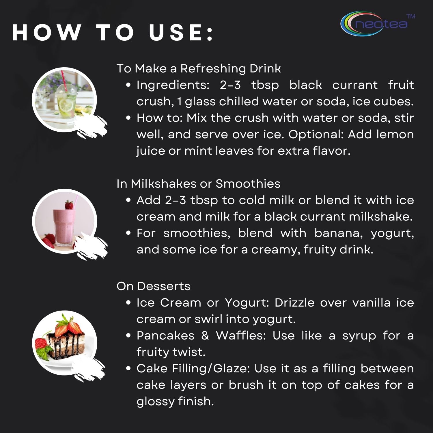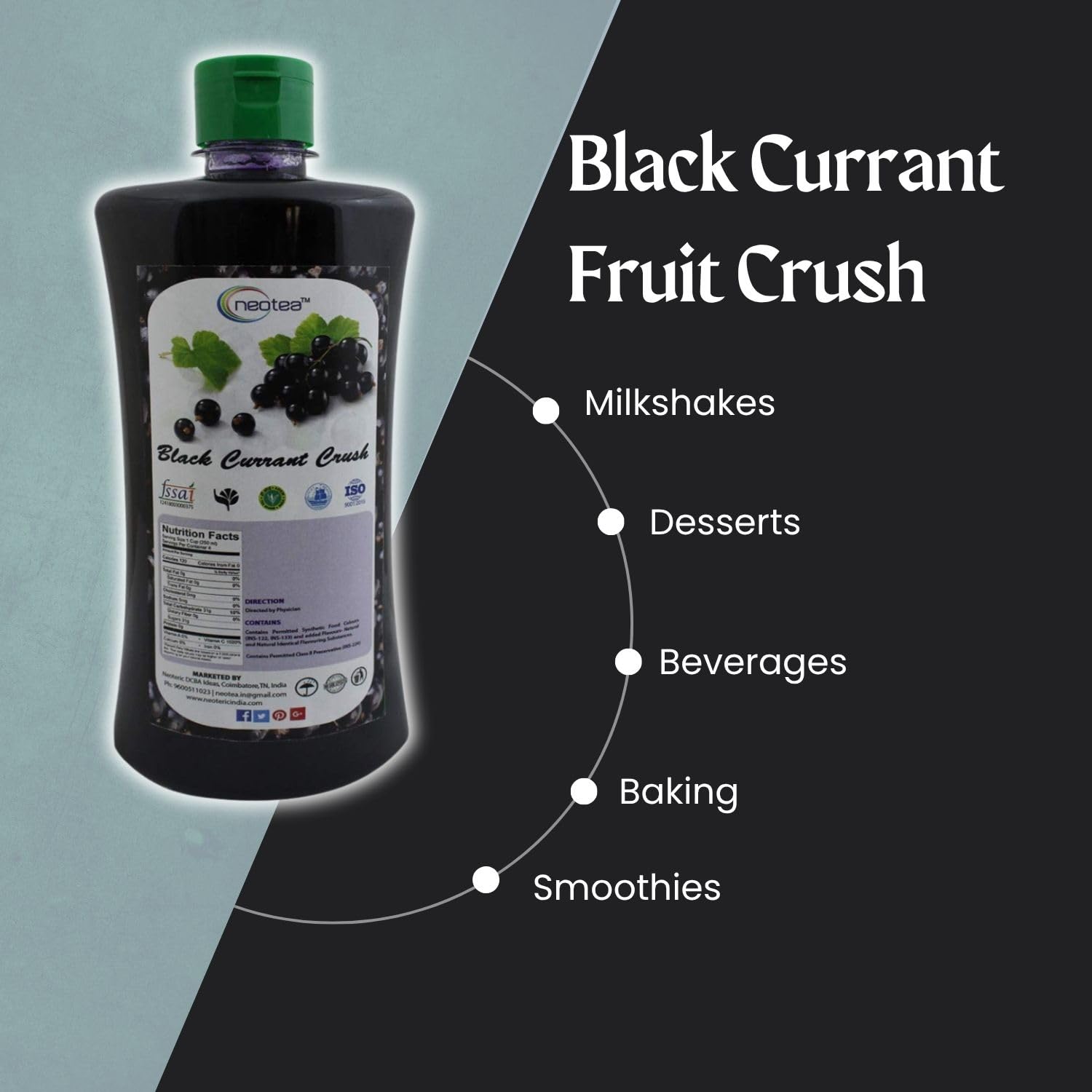 Neotea Black Currant Fruit Crush (250ml) offers a refreshingly juicy and delicious experience with every sip. Made from real black currant fruit pulp this beverage captures the authentic flavor and rich texture of fresh black currants delivering a taste thatâs both tangy and satisfying. Naturally sweetened it contains no artificial sugars flavors or preservatives making it a healthier and more natural alternative to sugary sodas. Whether you're enjoying it on the go with meals or as a refreshing break during the day Neotea Black Currant Fruit Crush is the perfect choice for hydration and enjoyment. The 250ml bottle is conveniently sized for quick and easy access while its refreshing taste makes it suitable for all ages. Choose Neotea Black Currant Fruit Crush for a wholesome fruity drink thatâs free from artificial additives and packed with real fruit goodness.