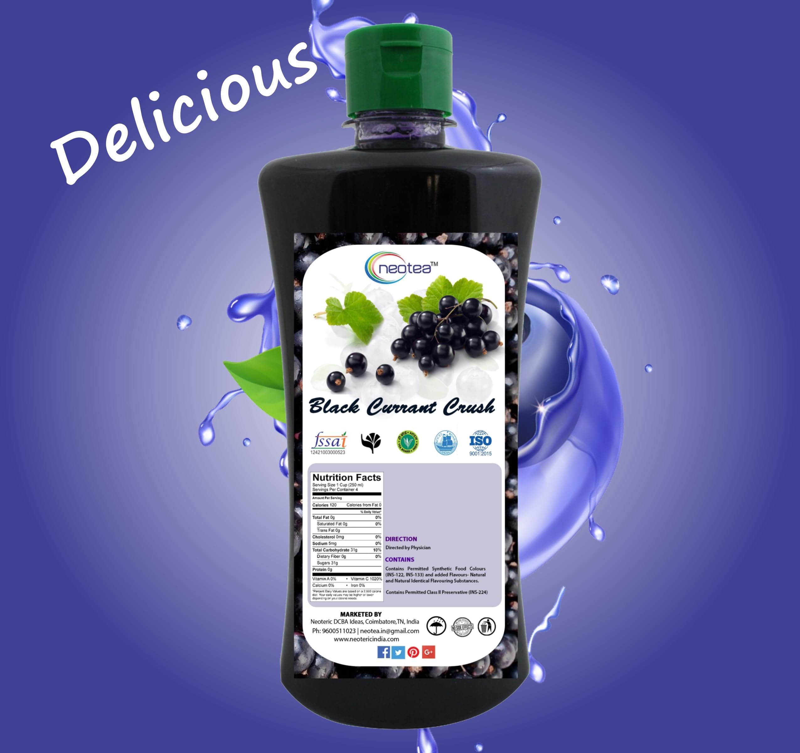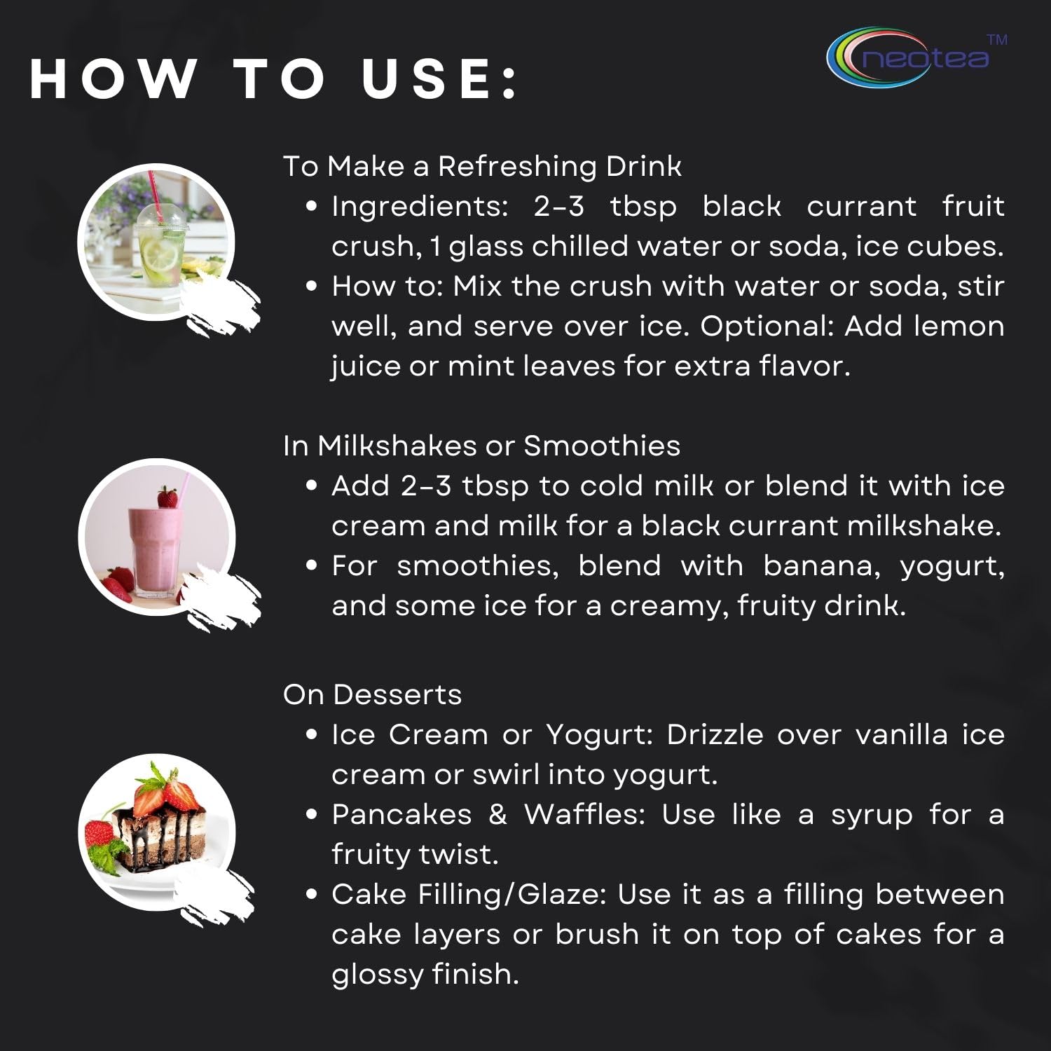 Neotea Black Currant Fruit Crush (500ml) is a deliciously refreshing beverage made from real black currant fruit pulp offering a tangy rich flavor in every sip. Naturally sweetened it contains no artificial sugars flavors or preservatives providing you with a healthier more natural alternative to sugary drinks. The smooth texture and fresh taste make it the perfect drink for any time of day whether you're enjoying it on the go at a meal or as a refreshing treat. With its 500ml size this fruit crush is ideal for sharing with family and friends or keeping in your fridge for multiple servings. Suitable for all ages itâs the perfect drink for kids and adults alike providing a wholesome and satisfying refreshment. Choose Neotea Black Currant Fruit Crush for a pure fruity drink thatâs free from artificial additives and full of natural goodness.