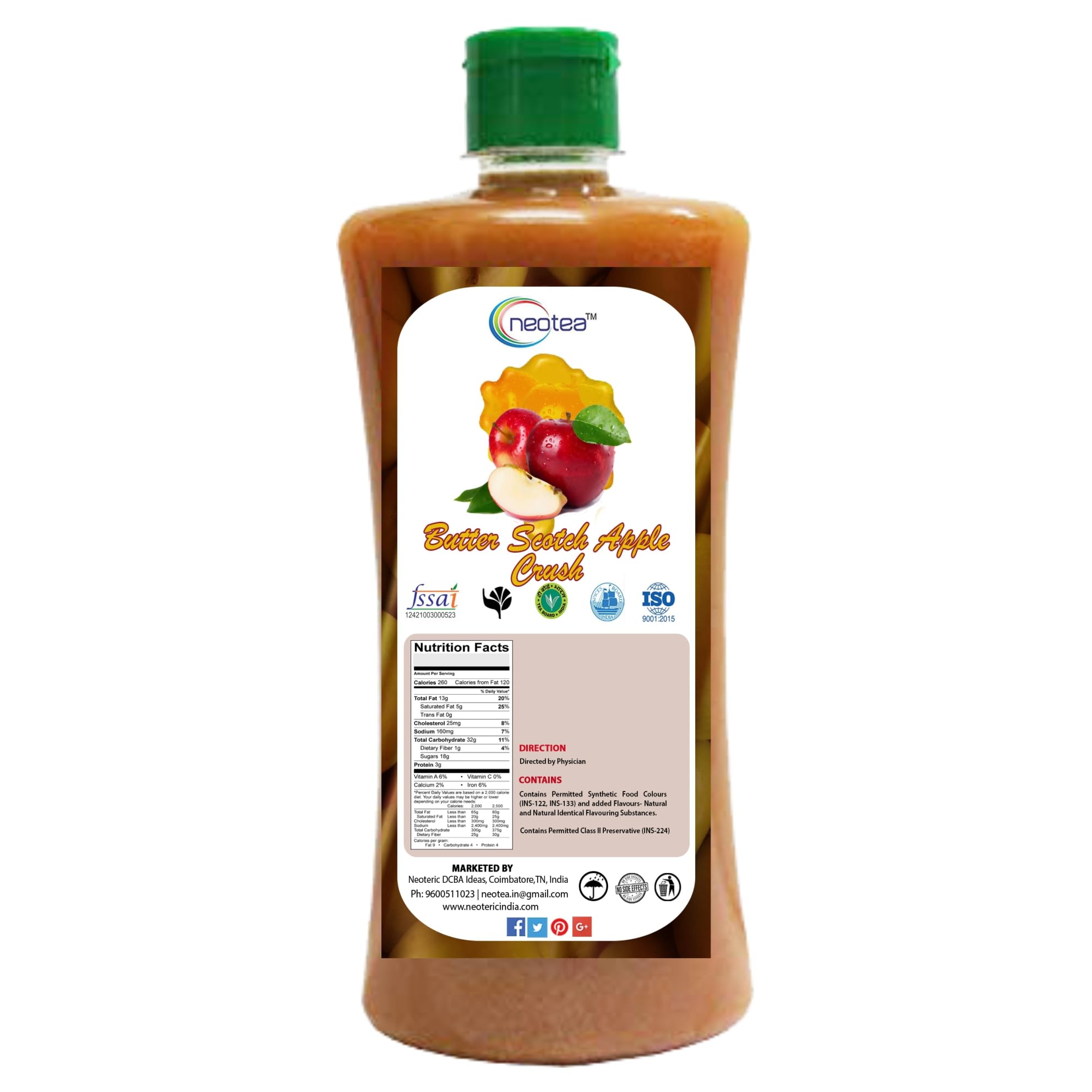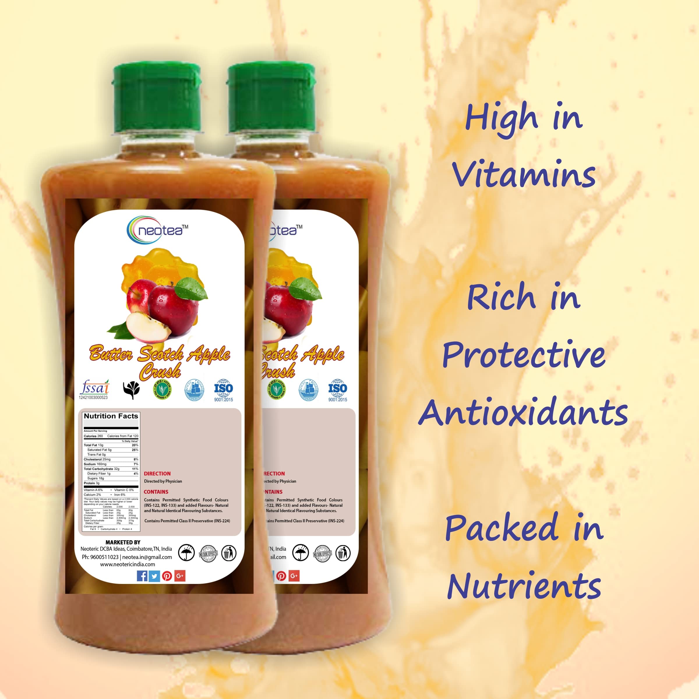 Neotea Butterscotch Crush is a golden-yellow concentrate with a rich thick and smooth texture loaded with apple pulp and the delightful flavor of butterscotch. Ideal for crafting delicious shakes mocktails smoothies and more this beverage concentrate offers a unique and indulgent flavor experience. Itâs the perfect way to enhance your favorite drinks with the sweet creamy taste of butterscotch combined with the refreshing tartness of apple. Key Features: Rich and Flavorful: Enjoy the thick smooth texture packed with apple pulp and sweet butterscotch flavorings for a satisfying drink experience. Versatile Use: Perfect for making shakes smoothies mocktails or as a topping for desserts adding a delightful touch to any recipe. Premium Quality Ingredients: Made with sugar 35% apple pulp and carefully selected ingredients to bring you a unique blend of sweet and tart flavors. Authentic Taste: Contains natural nature-identical and artificial flavoring substances to maintain a rich butterscotch and apple flavor with every sip. Trusted Brand: Neotea is known for offering high-quality health and household products including vitamins dietary supplements dry fruits herbal powders and organic cocoa powders providing you with a wide range of health-conscious options. With Neotea Butterscotch Crush you can enjoy a delicious indulgent beverage in just minutes. Itâs the perfect addition to your pantry for creating refreshing sweet drinks that everyone will love!