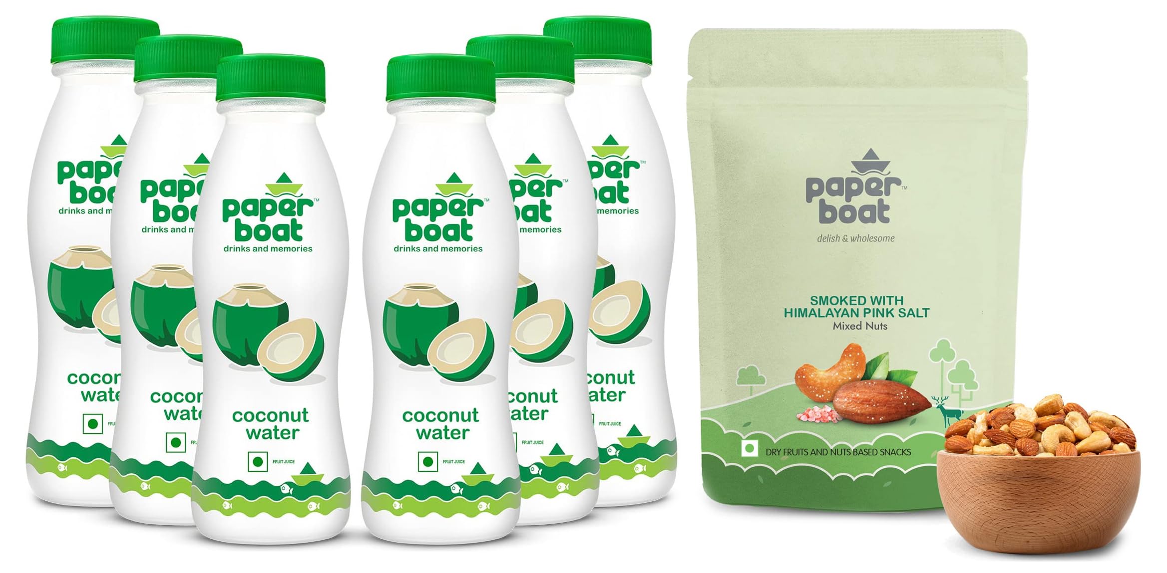 Paper Boat Smoked and Roasted Mixed Nuts with Himalayan Pink Salt Premium Dry Fruit Mix | Almonds & Cashews Pouch (200g)Inspired by the traditions of Indian roasting artistry this here is a product that lingers both in terms of taste and texture. Crisp crunchy almonds and cashews carefully roasted in Himalayan pink salt. With great taste comes great responsibility and so we give you a mix that has been perfectly smoked using naturally dried wood chips for that succulent flavour. From the choicest nuts to cleanest salt this is our effort to give you the best of ingredients in the most delish and wholesome way!Paper Boat Coconut Water Refreshing Coconut Flavour Vital Minerals (Pack of 6 200ml Each)The sweet taste of nature's coolest hydrant is reminiscent of many evenings at the beach. We'd have just enough money for one treat. After a sweaty evening filled with activities like running and playing ball the whole bunch of cousins elder ones being in charge of course would invariably end up at their favourite nariyal pani wala who would help us pick the sweetest coconuts (it's still a mystery to me how they can always tell those ones apart). To think that all these years later we still pick a nariyal pani to cool down on a hot summer day that says a lot about our allegiance to this natural coolant. Sadly there's not as much playtime anymore but as long as there's coconut juice all we got to do is shut our eyes and be transported giggles laughter and all.