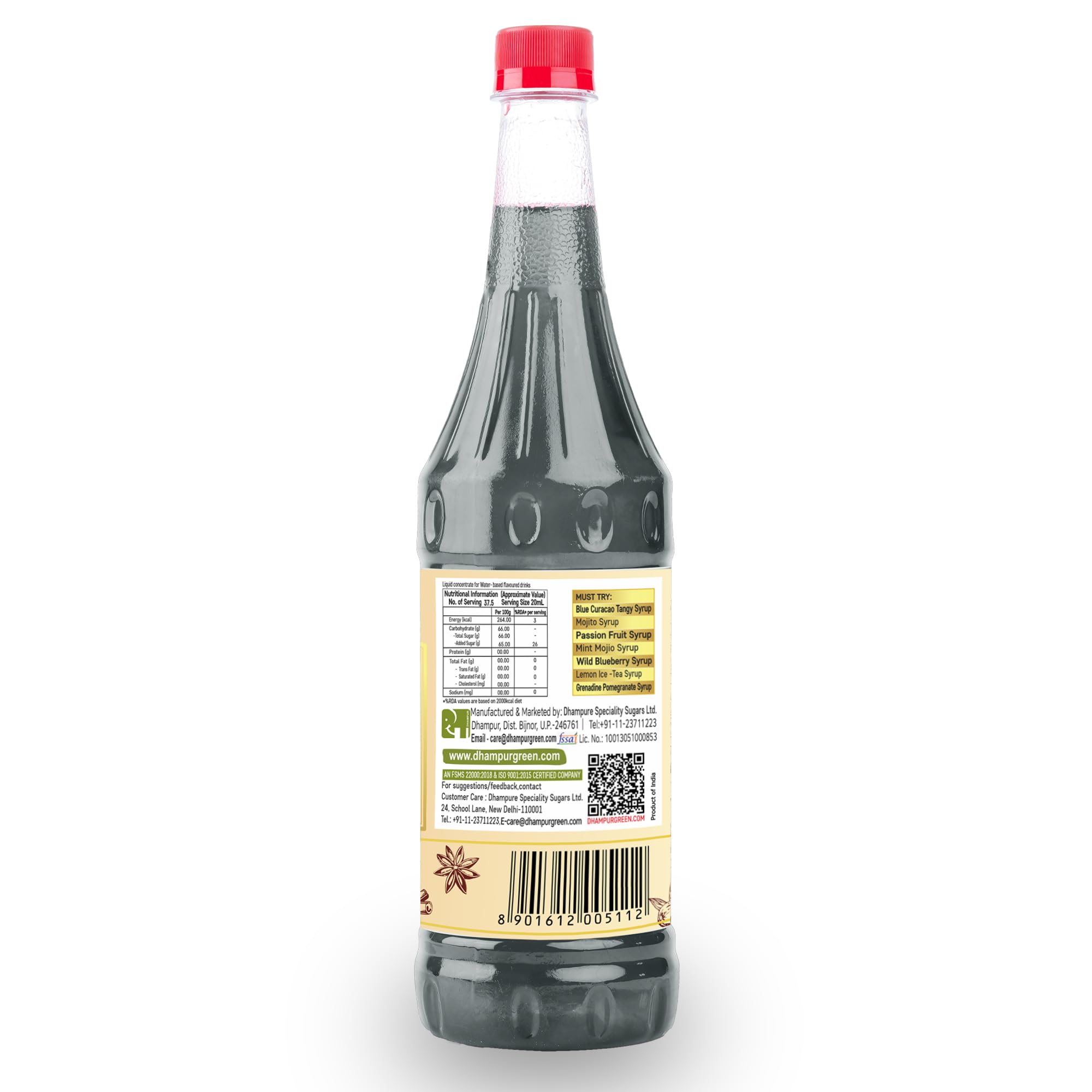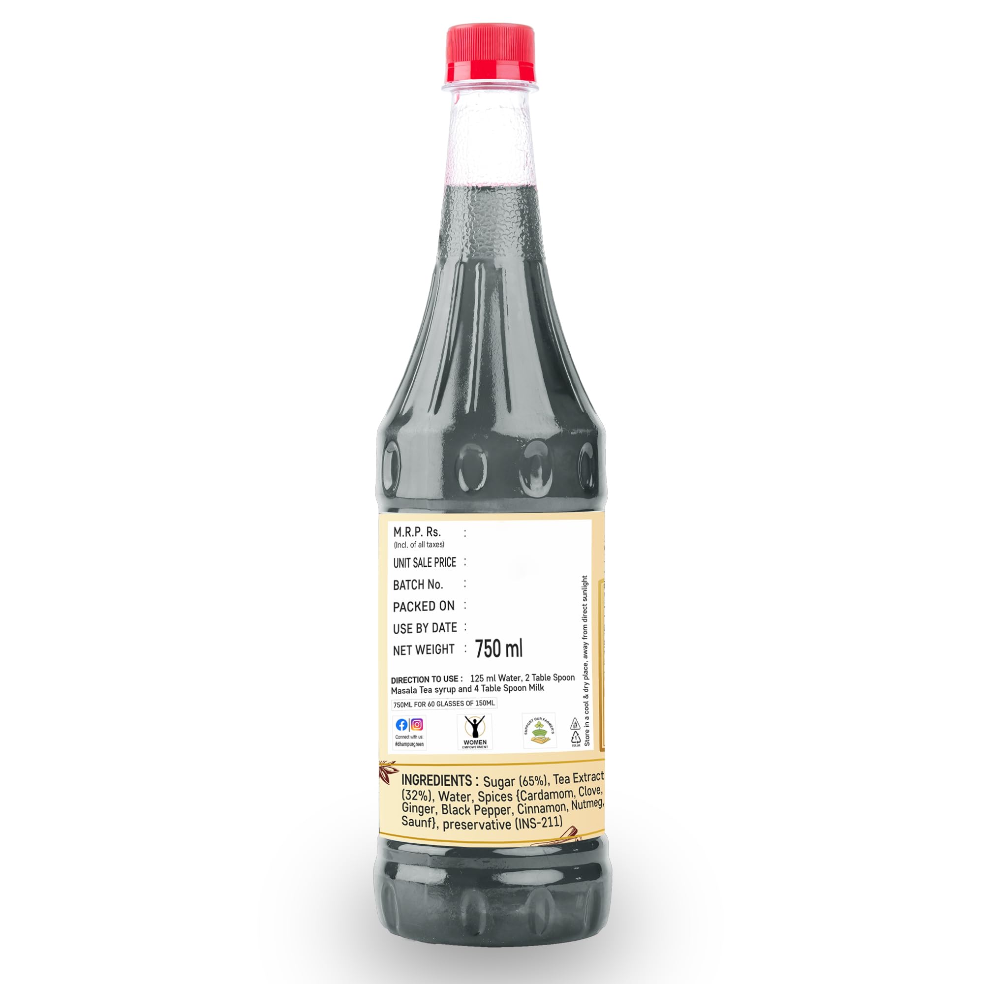 Introducing Dhampur Green's delightful Masala Tea in a convenient 750ml bottle designed to tantalize your taste buds and transport you to the heart of India's rich tea culture. Crafted with care and precision this aromatic infusion is a harmonious blend of exquisite flavors making every sip a memorable experience. Our Masala Tea is a symphony of carefully selected ingredients each contributing to its unique and bold flavor profile. With a base of premium tea extract (32%) this brew is elevated by the perfect balance of sweetness provided by 100% pure sugar (65%). What truly sets this Masala Tea apart however is the infusion of a tantalizing array of spices including Cardamom Clove Ginger Black Pepper Cinnamon Nutmeg and Saunf. These spices are expertly combined to create a rich fragrant and spicy undertone that dances on your palate with every sip. We take pride in using only the highest quality ingredients ensuring that each drop of this Masala Tea is a testament to the authentic and time-honored flavors of India. To preserve its freshness we've added a touch of preservative (INS-211) guaranteeing that you can savor the same great taste with every pour. Whether you're starting your day winding down or simply seeking a comforting and aromatic beverage Dhampur Green's Masala Tea is the perfect companion. It's a journey of flavor that encapsulates the essence of India's chai tradition in every bottle. Experience the warmth spices and sweetness of this exquisite blend that will leave your senses tingling and your heart content. Dhampur Green Masala Tea - where tradition meets convenience for an unforgettable tea experience.