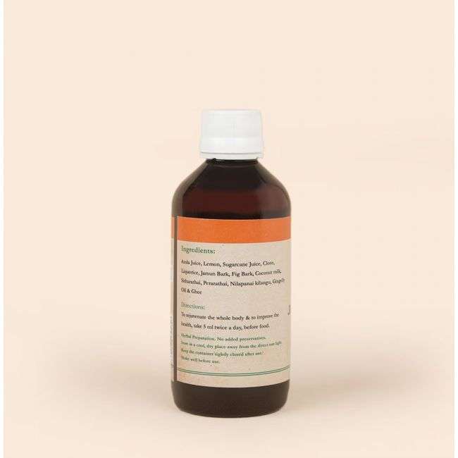 A powerful herbal formulation passed down through generations of Siddha practitioners - Jeevamritham.The meticulous process of preparing this potent potion starts with a sacred pooja, followed by some consecrated chants throughout the duration. Handmade in small batches with carefully selected ingredients, Jeevamritham is known to have healing and rejuvenating properties. A team of experienced microbiologists, chemists and Siddha practitioners ensure that each batch is of the highest quality. The Kashayam includes elements of Fig, Jamun, Amla, Lemon mixed with Coconut milk and Cow Ghee. When traditional wisdom is tapped into, true health and wellbeing come into being.Bring a balance to your system by bringing this potent potion into your life.