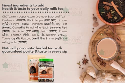 Bliss of Earth Masala CTC Tea (Chai) with Herbs & Spices is a healthy blend of Assam CTC Tea Leaf Assam Black Orthodox Tea and Twenty Herbs and Spices that produce a unique taste to traditional Milk Tea and also reduce the gas and acidity which is common with ordinary CTC tea. Our CTC Tea (Chai) is a Blended Herbal Tea made from finest Tea Leaves produces in Upper Assam region and enriched with Orthodox Black Tea Leaves to produce perfect Taste Aroma and Colour. It is blended by Tea Experts with Twenty Herbs and Spices that add a unique taste and herbal benefits making your everyday tea drinking more healthy.