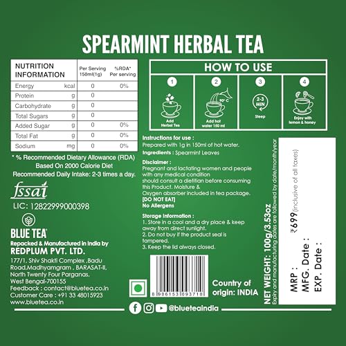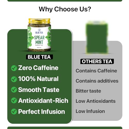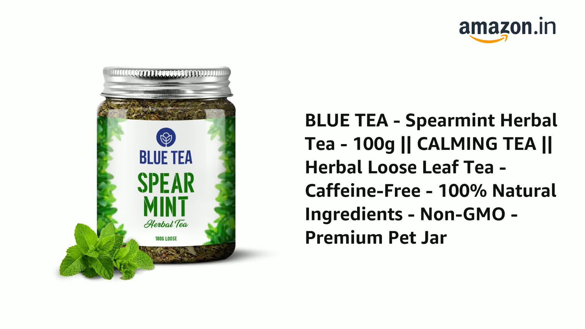 BLUE TEA - Spearmint Tea - 100 gm -100 Cups | Pcos Relief | Balances Hormones Reduces Facial Hair & Acne and Supports Digestion | Herbal Tea - Dried Loose Leaf - Caffeine Free | Featured in Shark Tank | Reusable Pet Jar