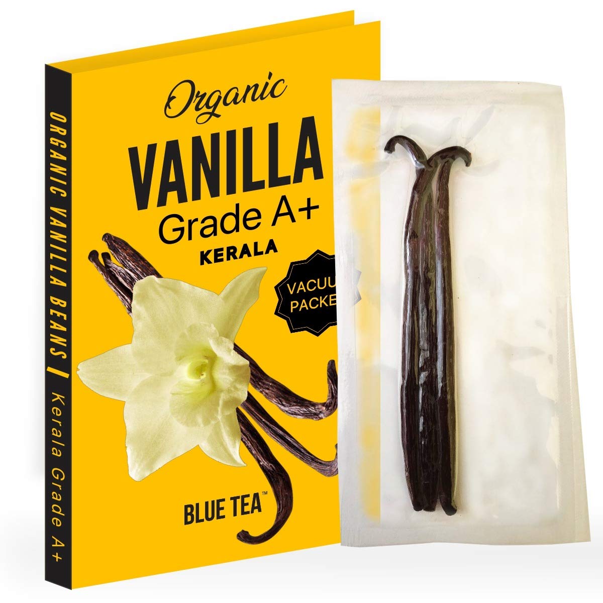 BLUE TEA - Vanilla Beans (Kerala Organic Farms) 3 Pods (12-15 grams) | Vacuum Sealed | Prime Gourmet Grade A 5~6 For Baking Extract Coffee Brewing Cooking | Featured In Shark Tank | Vacuum Pack